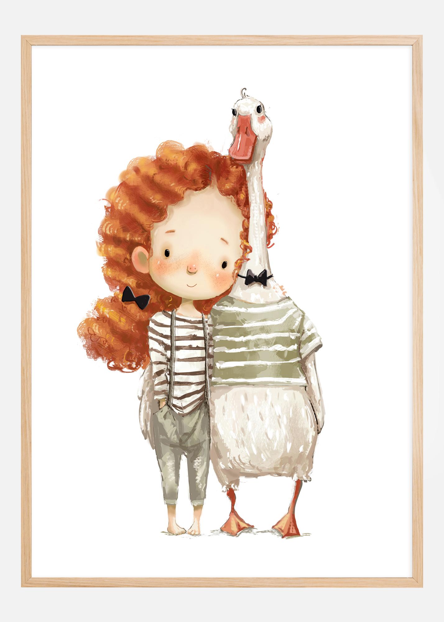 Ten zabawny i ujmujący plakat przedstawia młodą dziewczynkę z żywymi, rudymi lokami, stojącą obok swojego wiernego towarzysza, dużej kaczki. Dzielą ze sobą czuły i radosny moment, który został uchwycony w miękkich, ciepłych tonach malarstwa akwarelowego. Uroczy duet, z różowymi policzkami dziewczynki i ciekawym spojrzeniem kaczki, emanuje przyjaźnią i radością.