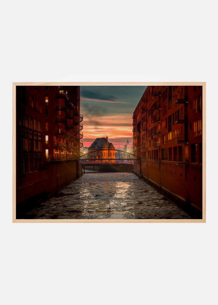 Zachód słońca nad starym magazynowym dystryktem Speicherstadt w Hamburgu ze swoimi kanałami i neogotyckimi budynkami z cegły. Fotografia z obszaru chronionego jako zabytek doskonale pasuje do domu osoby zainteresowanej architekturą lub historią. Plakat najlepiej prezentuje się w cienkiej metalowej ramie, która pasuje do surowej architektury i pięknie wygląda na ścianie z innymi obrazami miasta.
