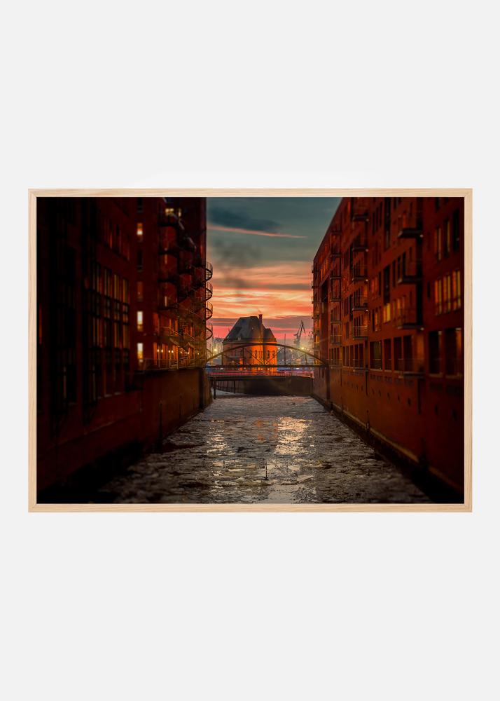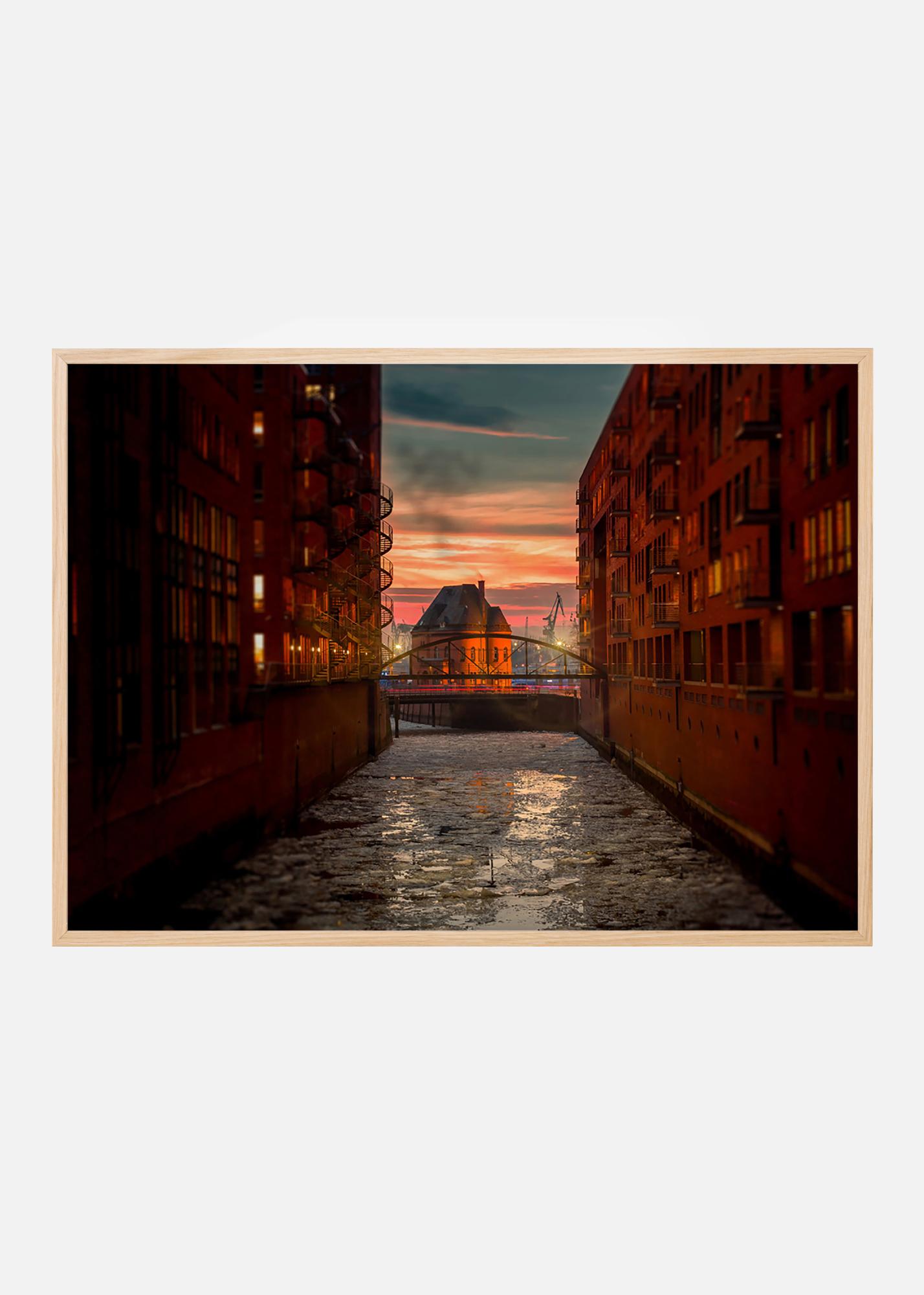 Zachód słońca nad starym magazynowym dystryktem Speicherstadt w Hamburgu z jego kanałami i neogotyckimi budynkami z cegły. Fotografia z obszaru objętego ochroną zabytków idealnie pasuje do domu miłośnika architektury lub historii. Plakat najlepiej prezentuje się w cienkiej metalowej ramie, która współgra z surową architekturą i wygląda elegancko na ścianie w towarzystwie innych zdjęć miasta.