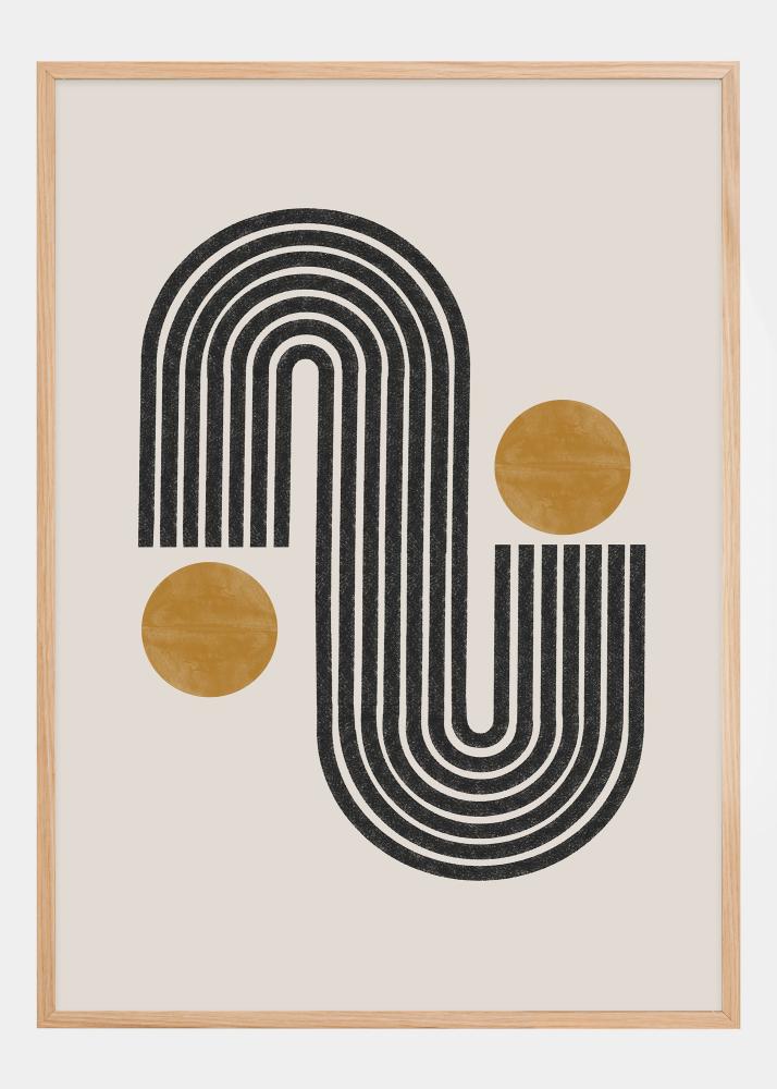 Odkryj świat eleganckiego piękna z naszym plakatem, który podkreśla kontrasty zarówno za pomocą formy, jak i koloru. Ten wydruk przedstawia dynamiczny czarno-biały wzór linii tworzący miękko falującą formę, zrównoważoną dwoma ochrowymi kołami, które nadają ciepłe i ziemne wrażenie. Ta minimalistyczna, ale efektywna konstrukcja zainspirowana estetyką mid-century modern oferuje poczucie spokoju i harmonii w każdej przestrzeni, w której się znajduje.