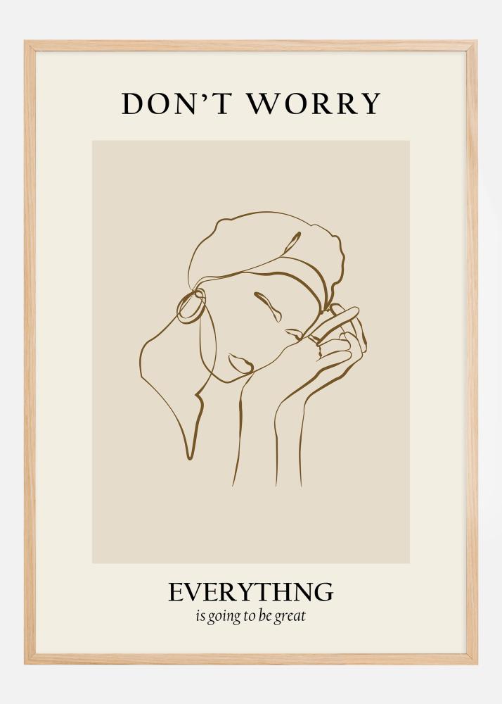 Ten artystyczny plakat uchwyca spokojny moment refleksji i wewnętrznego spokoju poprzez rysunek liniowy osoby trzymającej dłoń przy twarzy. Tekst "DON'T WORRY" dużymi literami przewyższa obraz, dostarczając uspokajającego przypomnienia, podczas gdy "EVERYTHING is going to be great" podkreśla przekaz bardziej przemyślaną tonacją. To nowoczesne dzieło sztuki jest idealne do stworzenia poczucia spokoju i optymizmu w domu lub biurze.