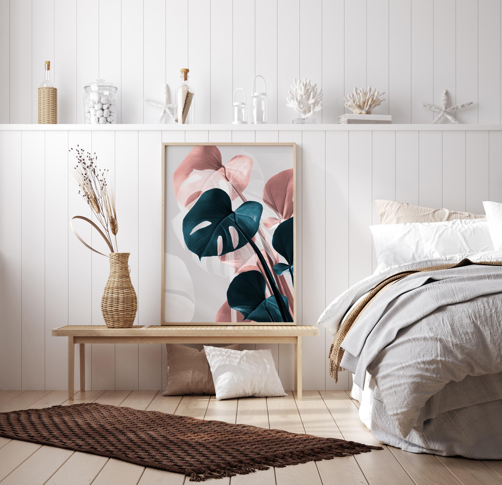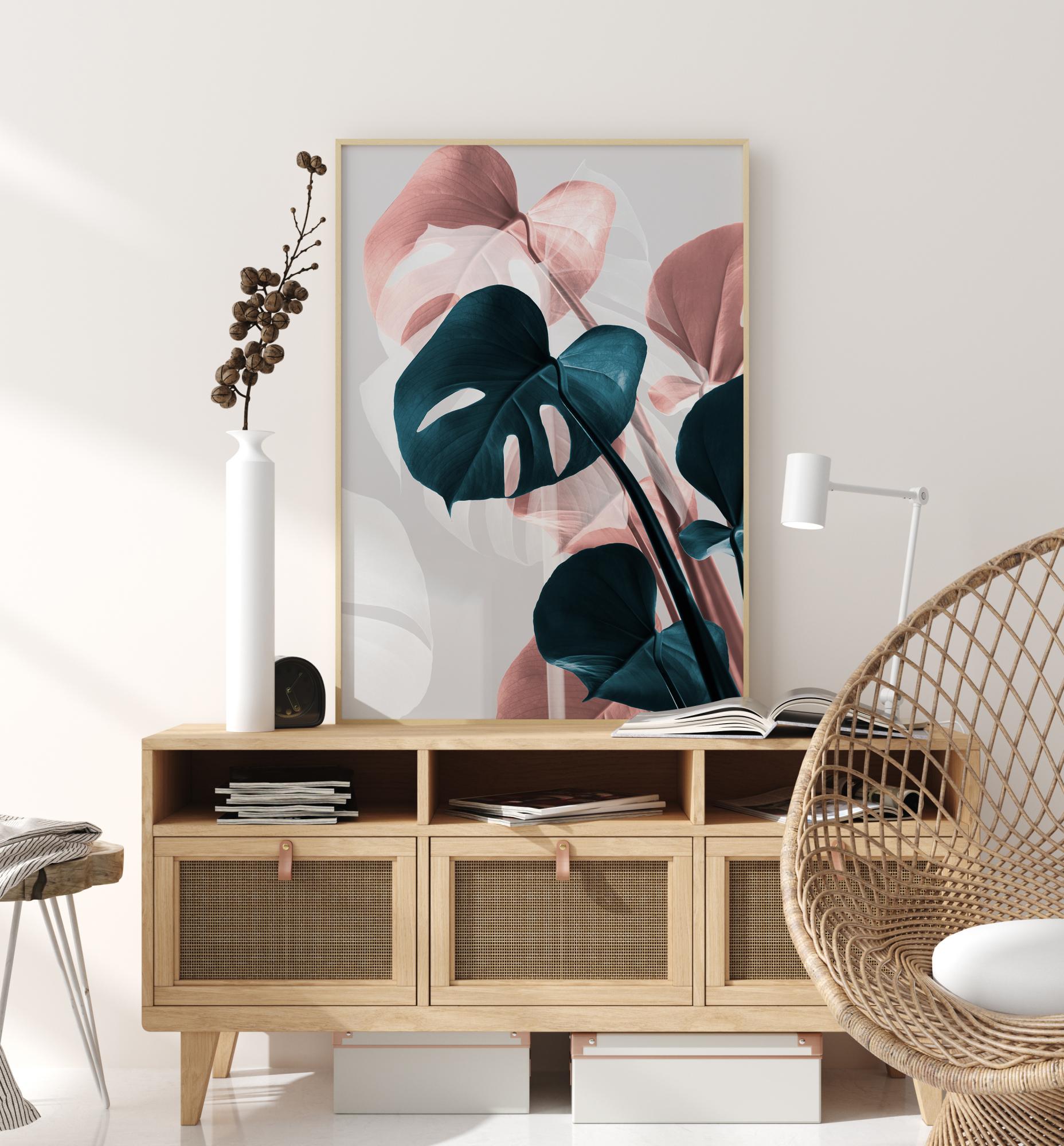 Piękny plakat z różowymi i ciemnozielonymi liśćmi monstery, który ukazuje doskonałą kreatywność w liściach. Na beżowym tle lśnią sercowate liście z pięknymi zielonymi i różowymi liśćmi. Liściaste wzory nadają ekscytujący charakter Twojemu domowi.