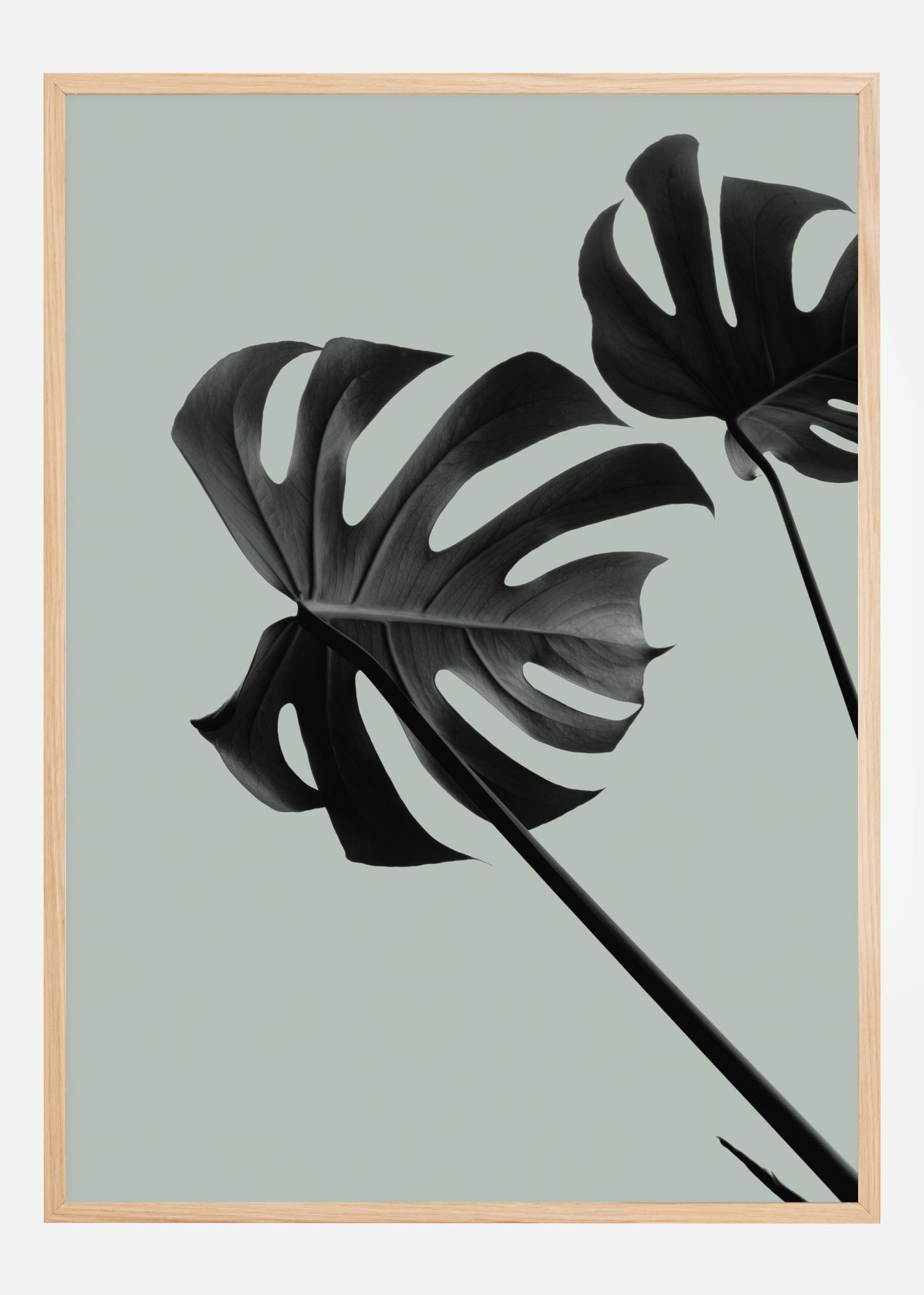 Czarno-białe zbliżenie dwóch liści monstery. Liście w kształcie serca widoczne są na matowoszarym tle, a chwilę tę podkreśla światło za piórkowatymi wzorami. Ten plakat jest idealny, aby wprowadzić ekscytujące uczucie tych przypominających serce liści do Twojego domu.