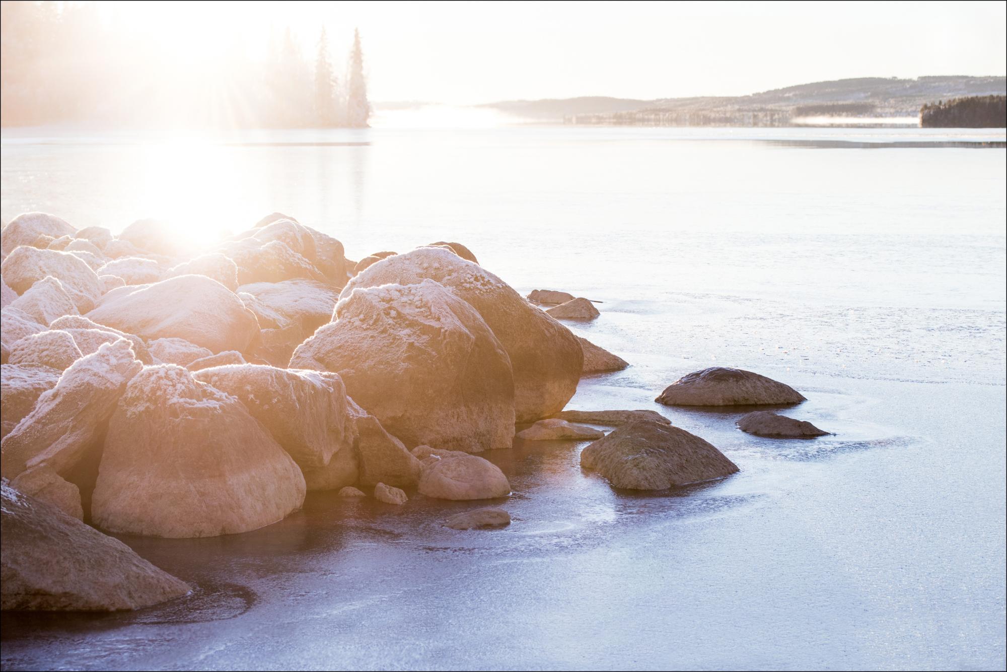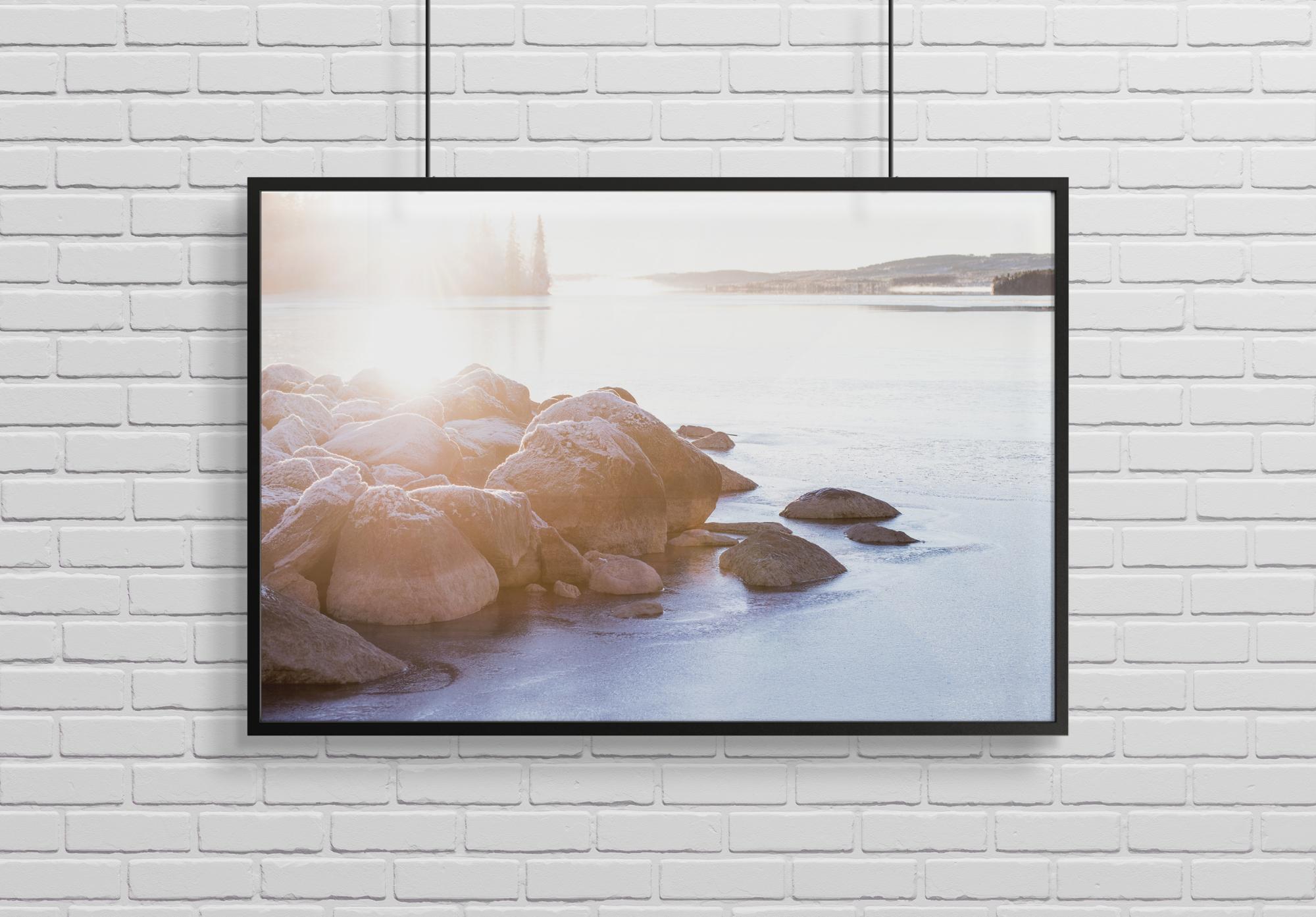 Olśniewający plakat krajobrazowy z klifami nad morzem wczesnym rankiem. Woda morska odbija światło słoneczne przez brązowe kamienne bloki, tworząc białą powierzchnię. Z niziną w tle ten plakat rozjaśni Twój salon.