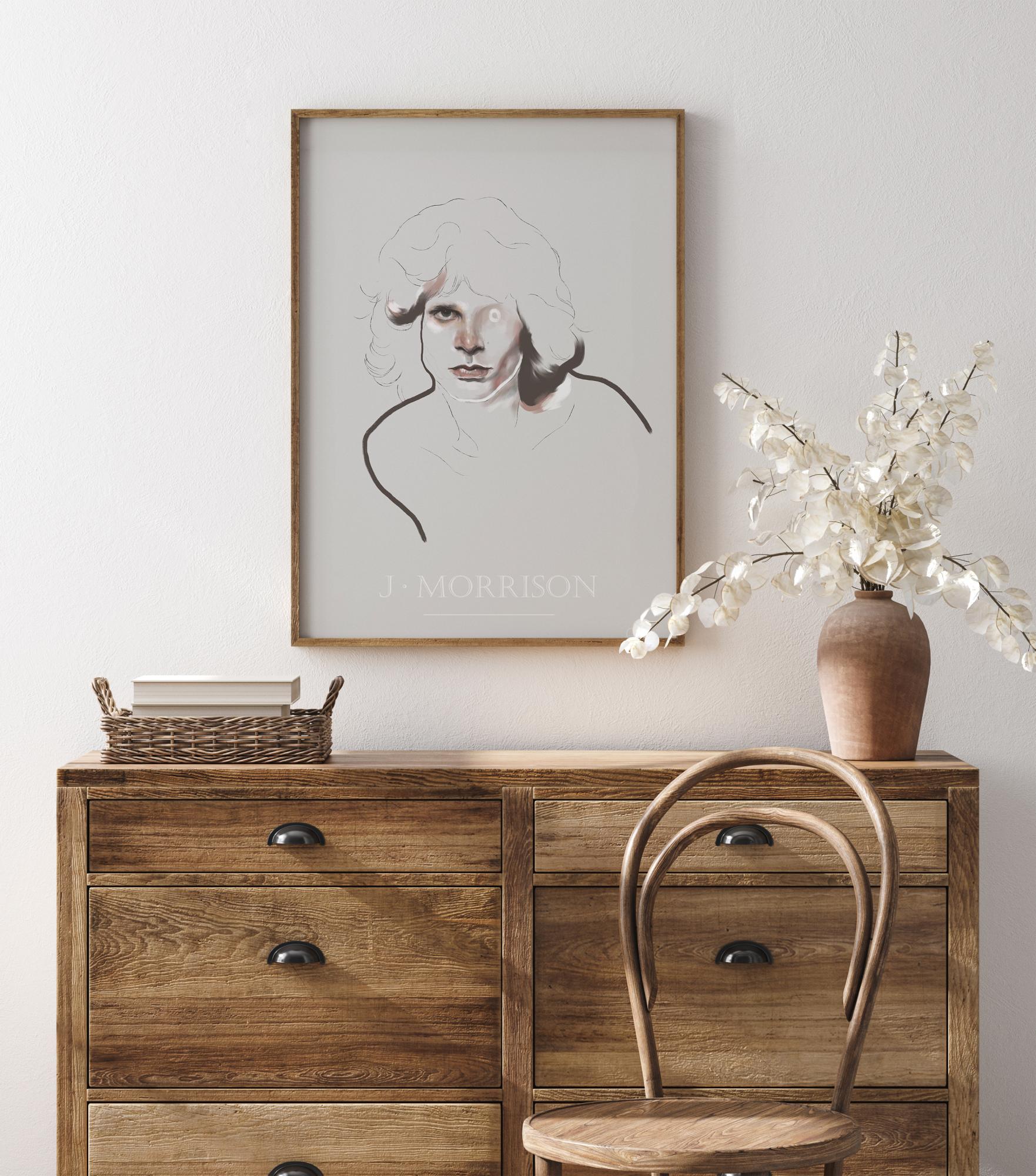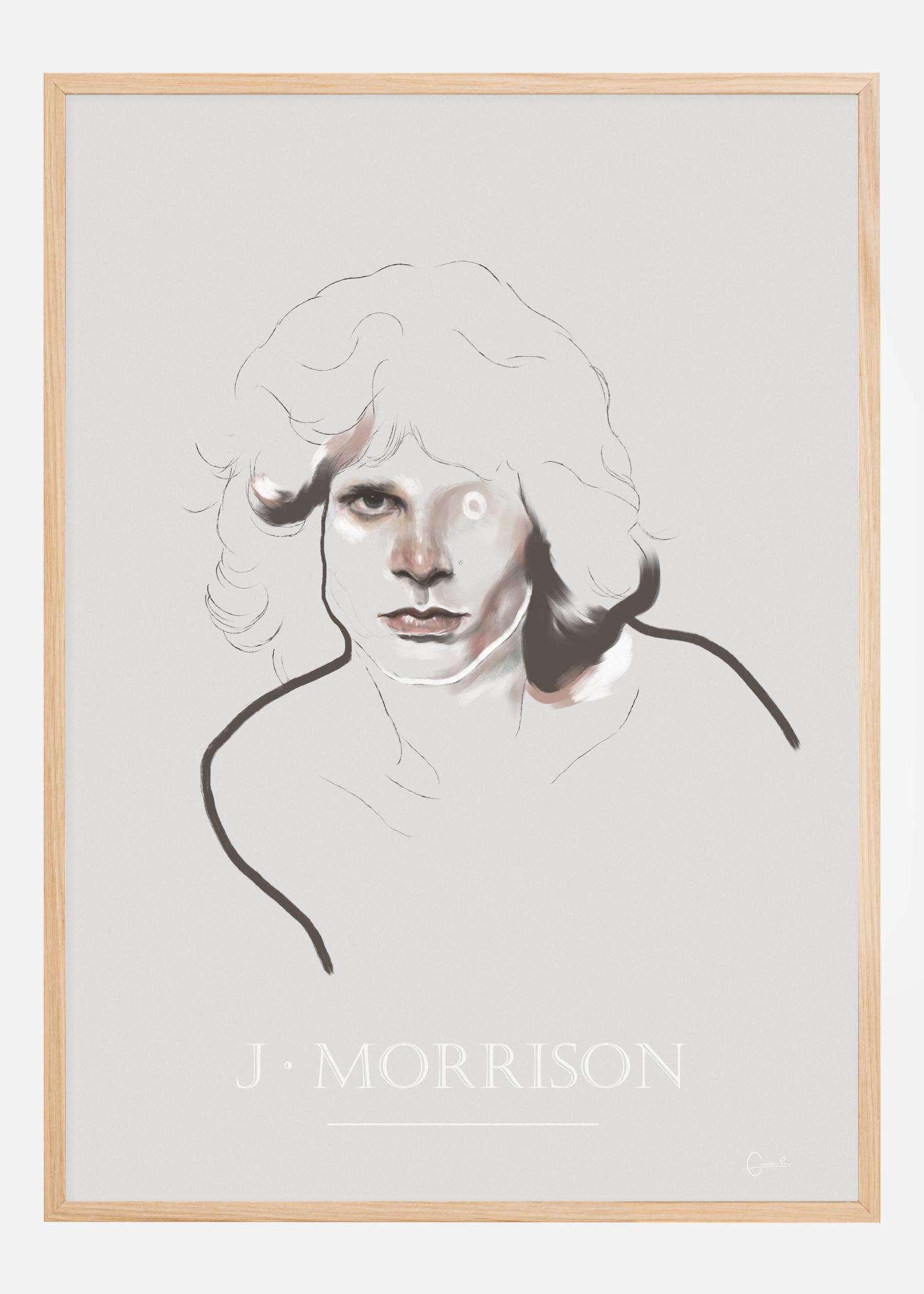 Piękny plakat z Jimem Morrisonem. Na beżowym tle głowa i ramiona artysty zostały narysowane czarnym ołówkiem, podczas gdy usta zostały obrysowane na brązowo. Lewe oko jest bez powieki. Idealny druk dla wszystkich miłośników muzyki.
