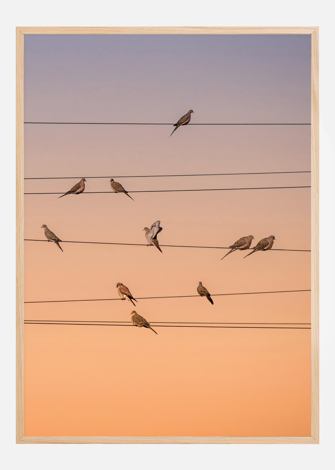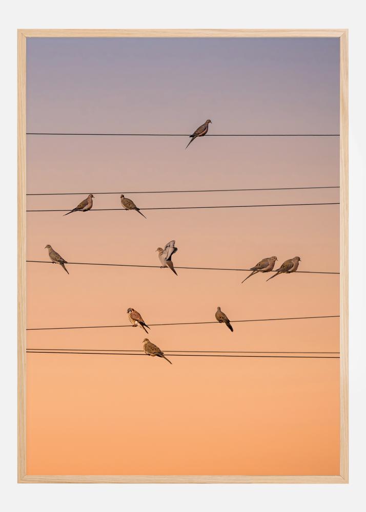 Fantastyczny plakat z ptakami siedzącymi na przewodach elektrycznych na tle pomarańczowego zachodu słońca. Ptaki i linie energetyczne przypominają nuty, przywodząc na myśl śpiew ptaków. Ten obrazek doskonale pasuje na każdą ścianę salonu.