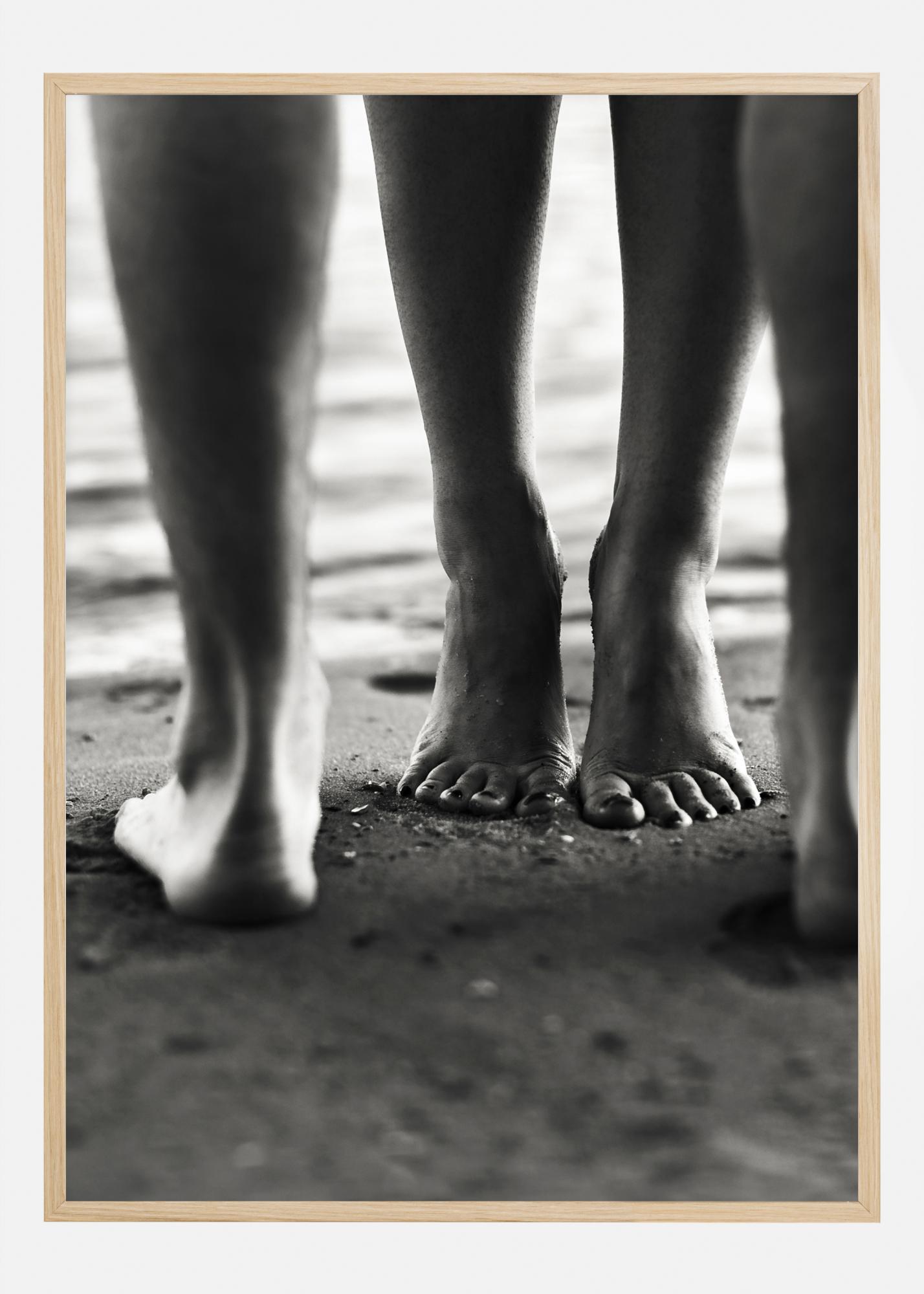 Romantyczny plakat z czarno-białym zbliżeniem czterech nóg na plaży. Obraz przedstawia dwie osoby stojące naprzeciwko siebie. Wzrok przyciąga postać stojąca na palcach. Ten piękny wydruk wprowadza romantyczną atmosferę i pasuje do Twojej sypialni, gdy chcesz dodać odrobinę romantyzmu.