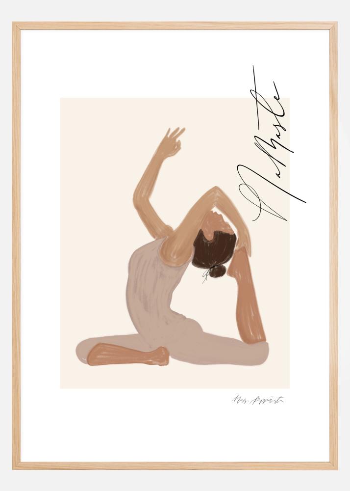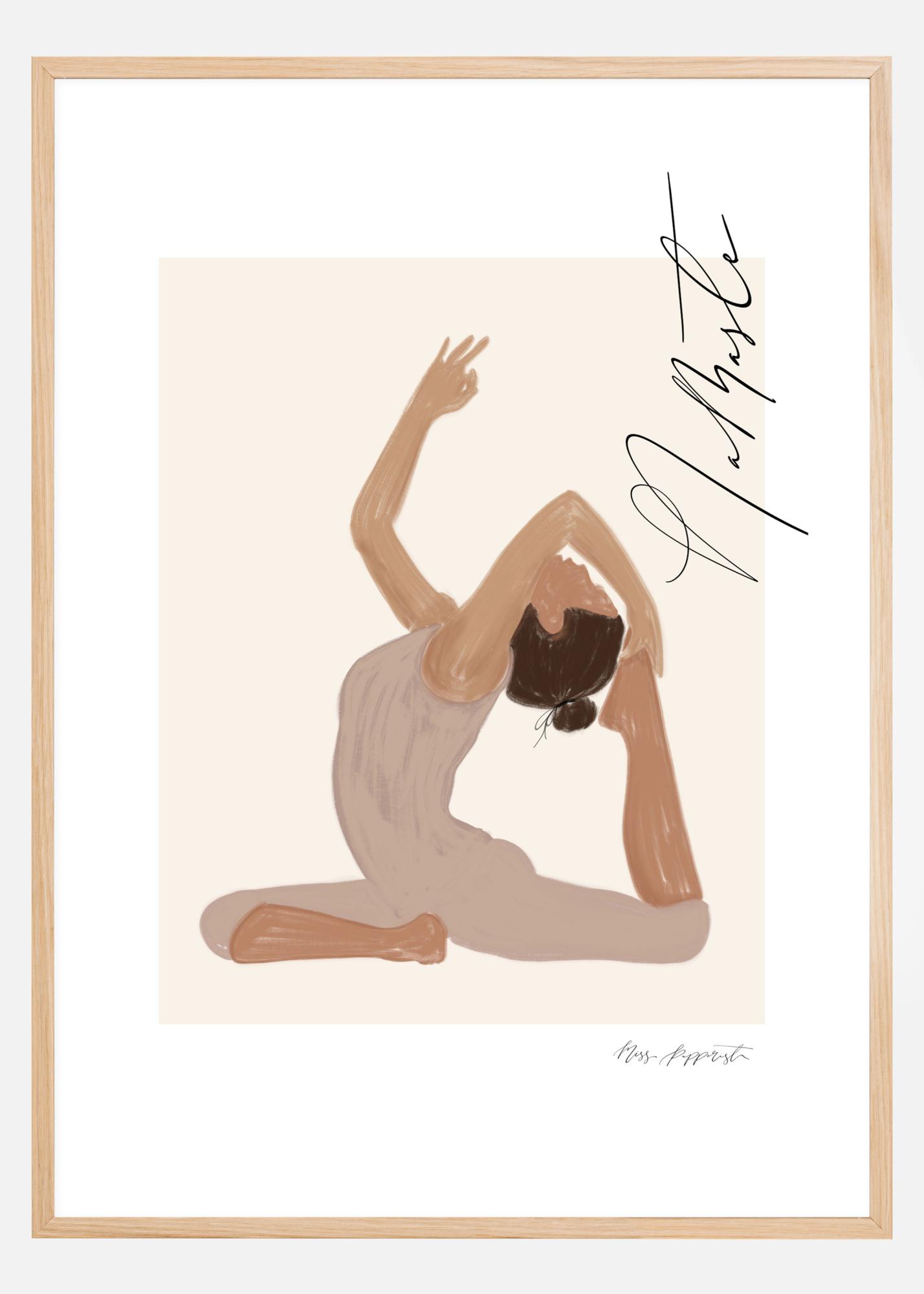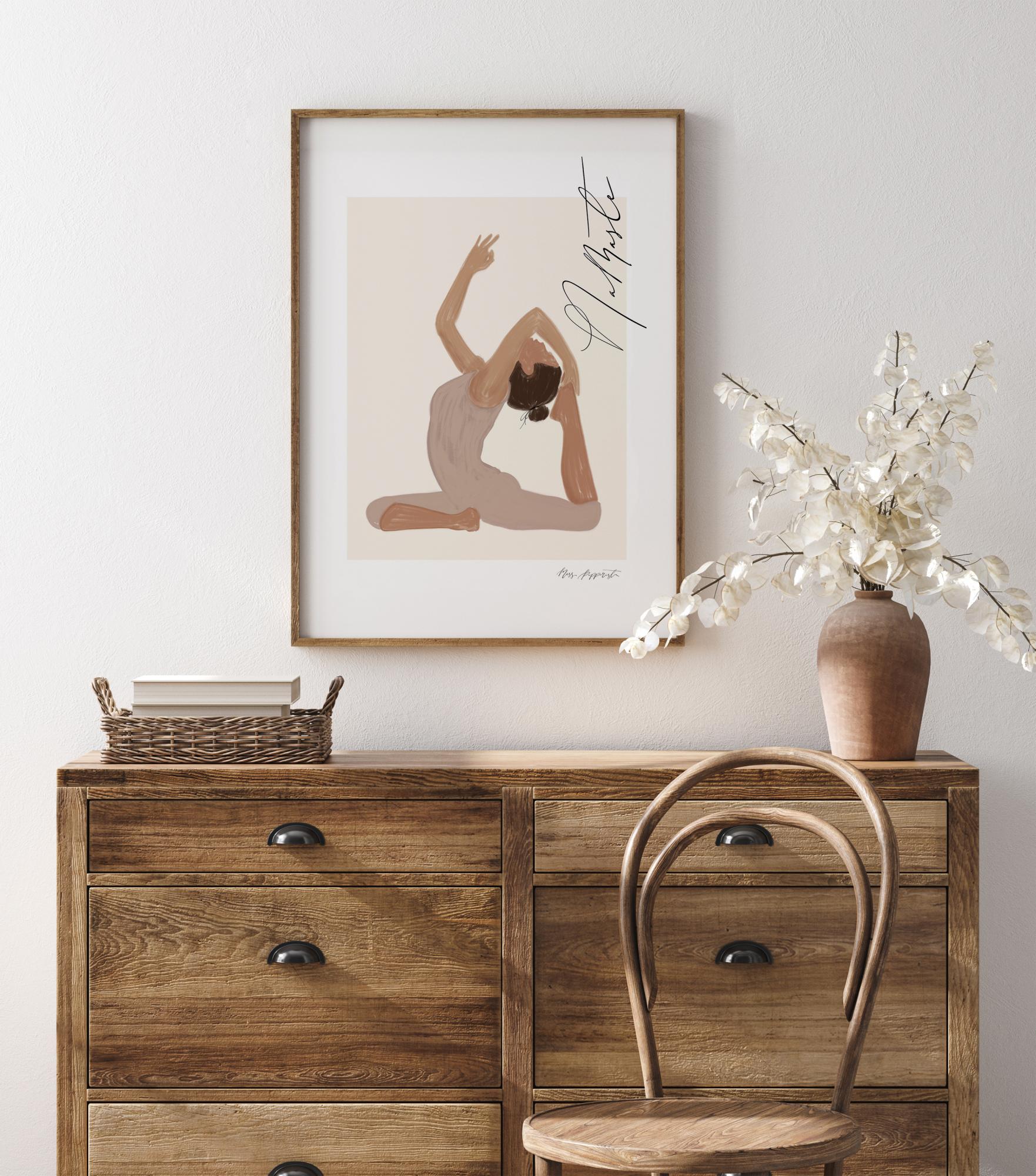 Plakat graficzny w delikatnych pastelach, przedstawiający kobietę w pozycji jogi z przesłaniem "Namaste" (Kłaniam się Tobie) w pięknej kaligrafii. Harmonijny i spokojny motyw oprawiony i podkreślony szerokim passepartout w kolorze białym, stworzony przez Jenny Skantz, Miss Papperista.
