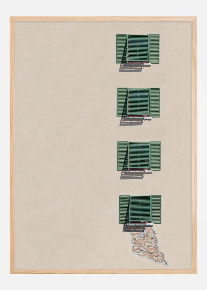 Dzieło, które może nosić tytuł "Sąsiedzki konflikt", przedstawia radykalny kontrast między porządkiem a chaosem poprzez zsynchronizowane okiennice w porównaniu z ostatnim oknem, gdzie część ściany wydaje się zawalić. Jednolite zielone okiennice na jednolitym tle wskazują na rodzaj przewidywalności i rutyny, podczas gdy uszkodzone okno z odsłoniętymi cegłami narusza tę harmonię, wprowadzając historię potencjalnego konfliktu lub zaniedbania.