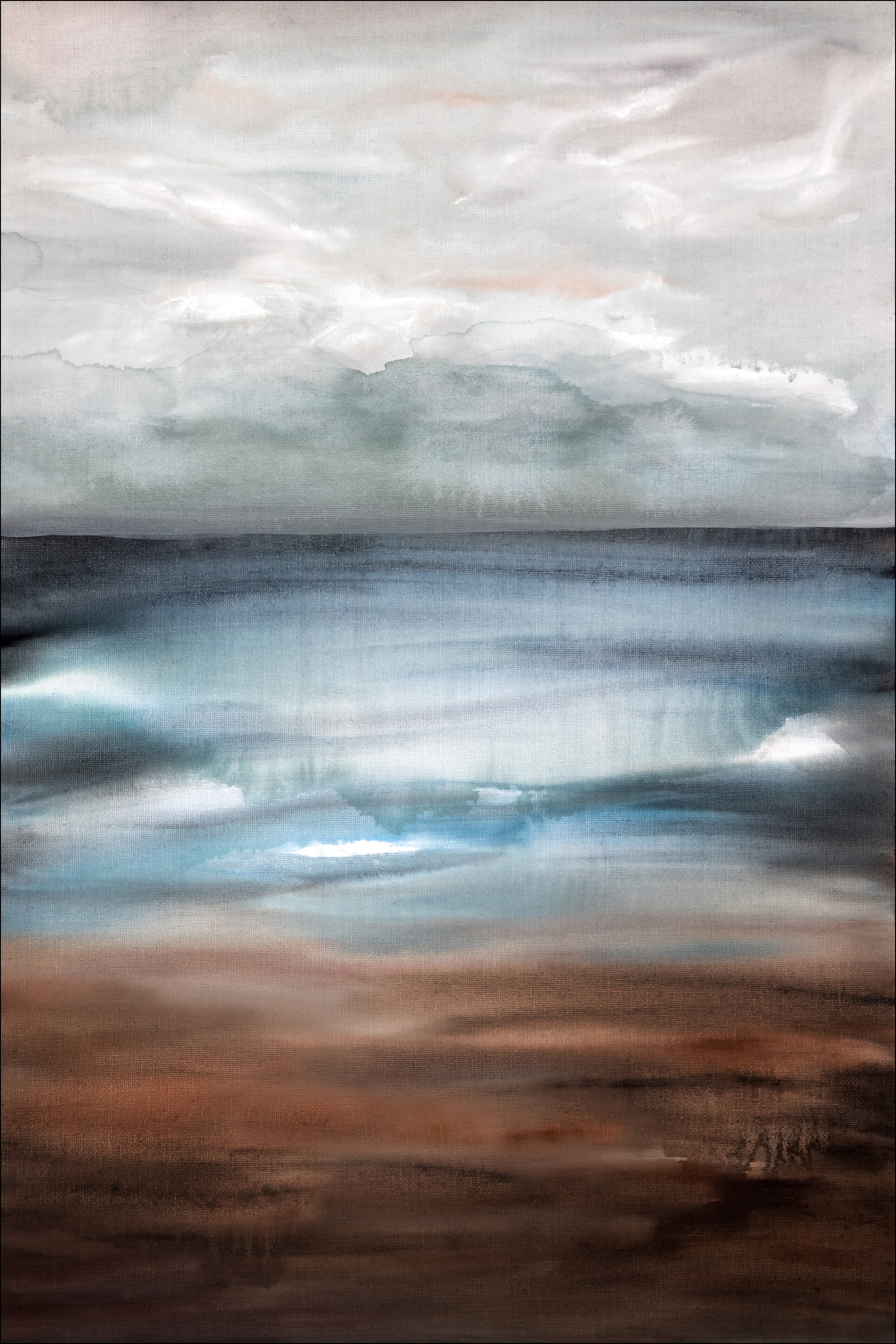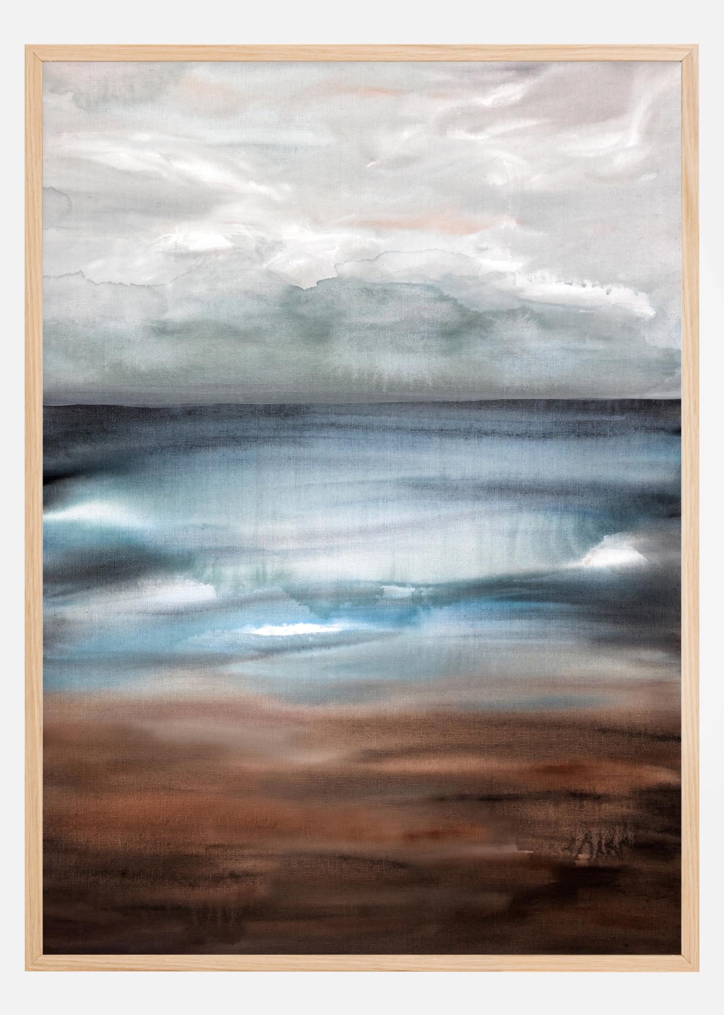 Relaksująca reprezentacja nowego dnia. Miękkie pastelowe kolory pokazują pochmurny poranek z mgłą nad morzem. Horyzont idealnie łączy się z szarymi i białymi chmurami. Z tym relaksującym i kojącym plakatem na ścianie możesz prawie usłyszeć morze.