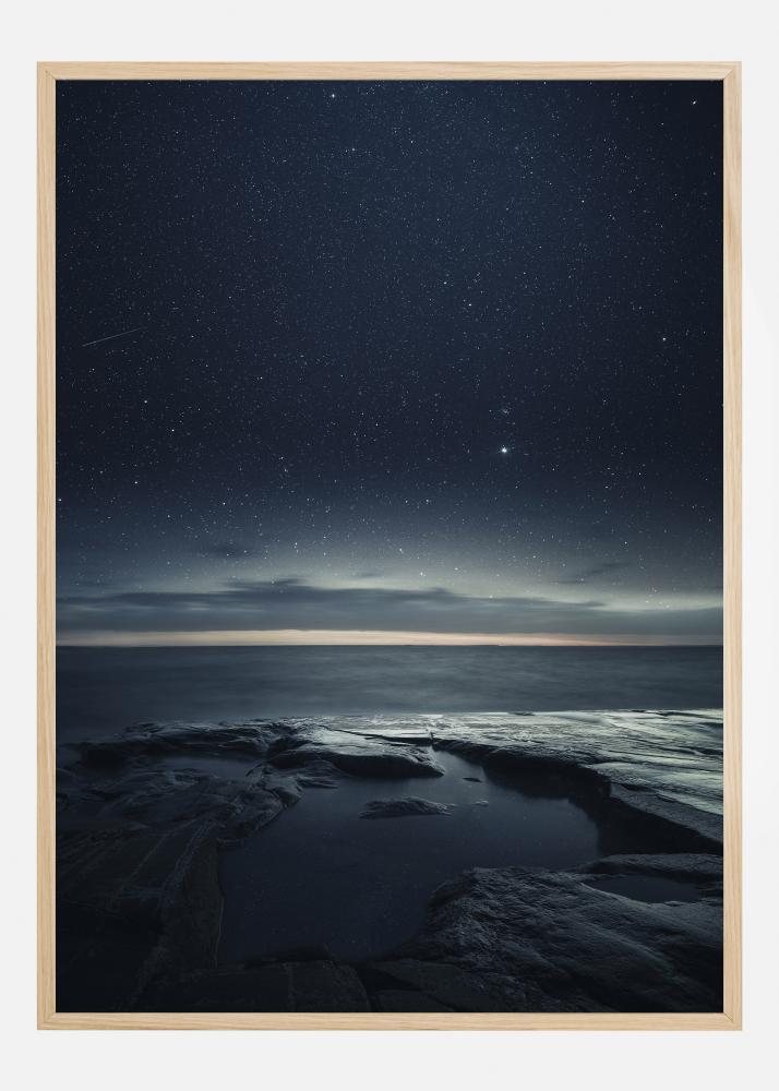 Niesamowity wydruk skalistej plaży z wodą odbijającą czyste, fioletowe niebo z migoczącymi gwiazdami. Horyzont jest wyraźnie widoczny dzięki białemu promieniowi światła, który rozciąga się nad morzem. To rzadki plakat z wieczorną magią, gotowy, aby dodać odrobinę energii do Twojego domu.