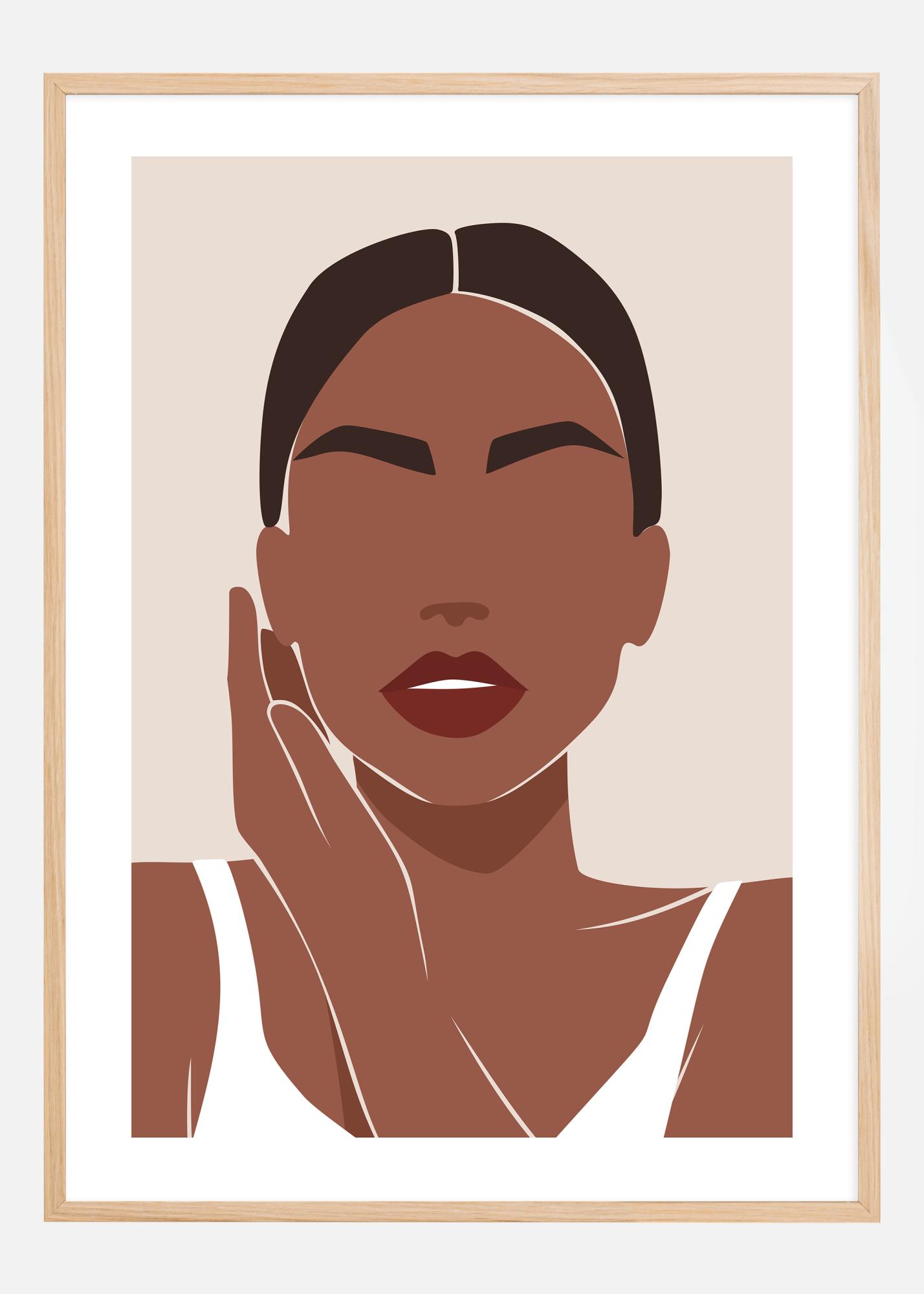 Ten estetycznie atrakcyjny plakat przedstawia kobiecą sylwetkę w stylizowanej i uproszczonej formie. Obraz zbudowany jest z ograniczonego spektrum kolorów składającego się z ziemistych tonów, od jasnego beżu po głębszy brąz, co daje ciepłe i przyjazne uczucie. Postawa kobiety jest zrelaksowana i zamyślona, co dodaje portretowi wrażenie spokoju i pewności siebie.
