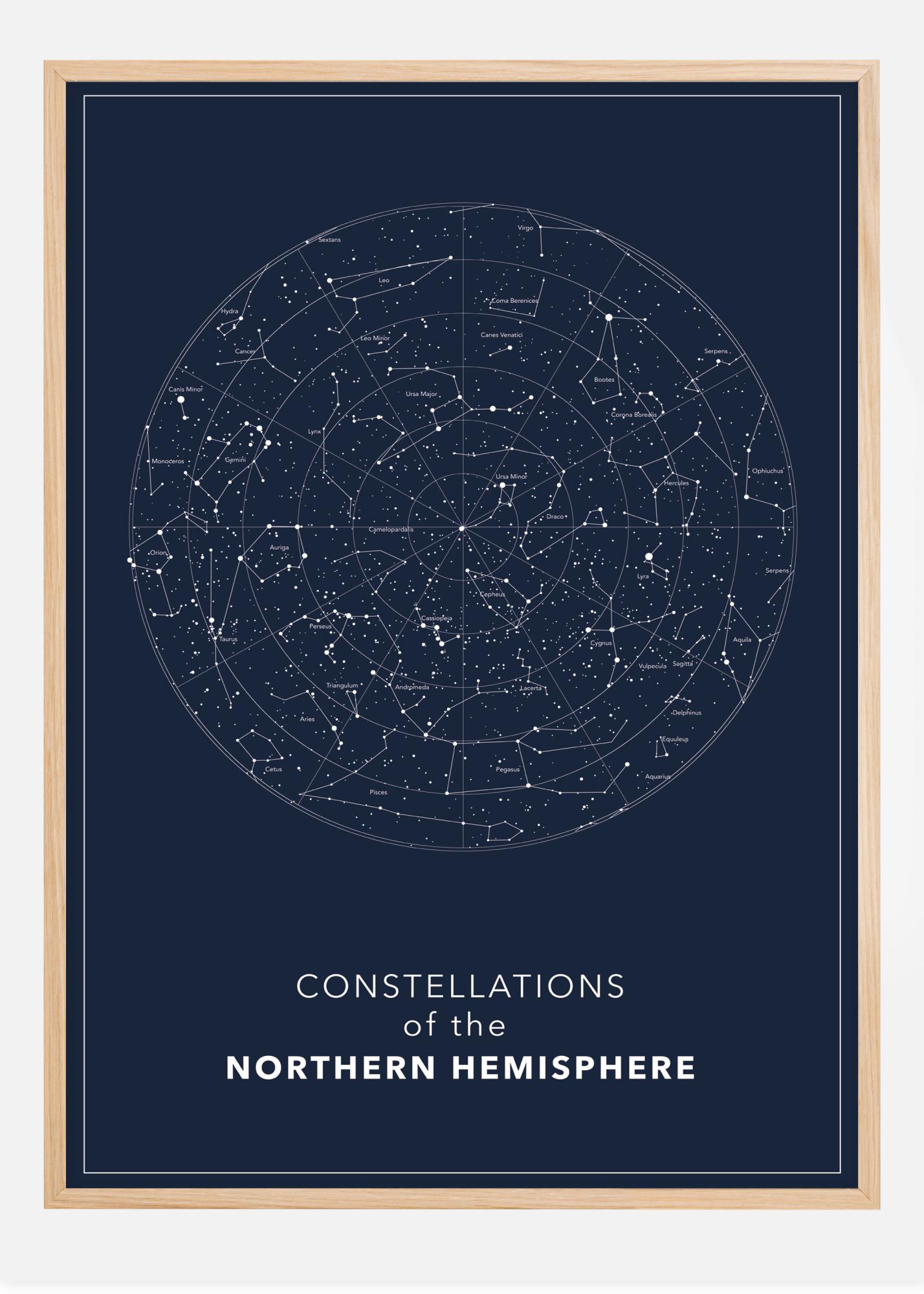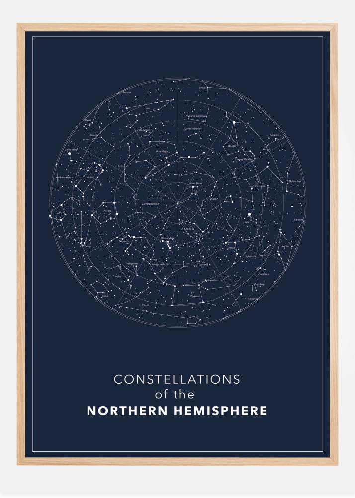 Plakat błyszczący z białym kołem i konstelacjami na północnym niebie gwiaździstym. Konstelacje są podkreślone delikatną białą linią z nazwą napisaną pod każdą konstelacją. Na ciemnoniebieskim tle jest to bardzo czytelne przedstawienie północnego nieba gwiaździstego. To idealny druk do powieszenia w pokoju do czytania.