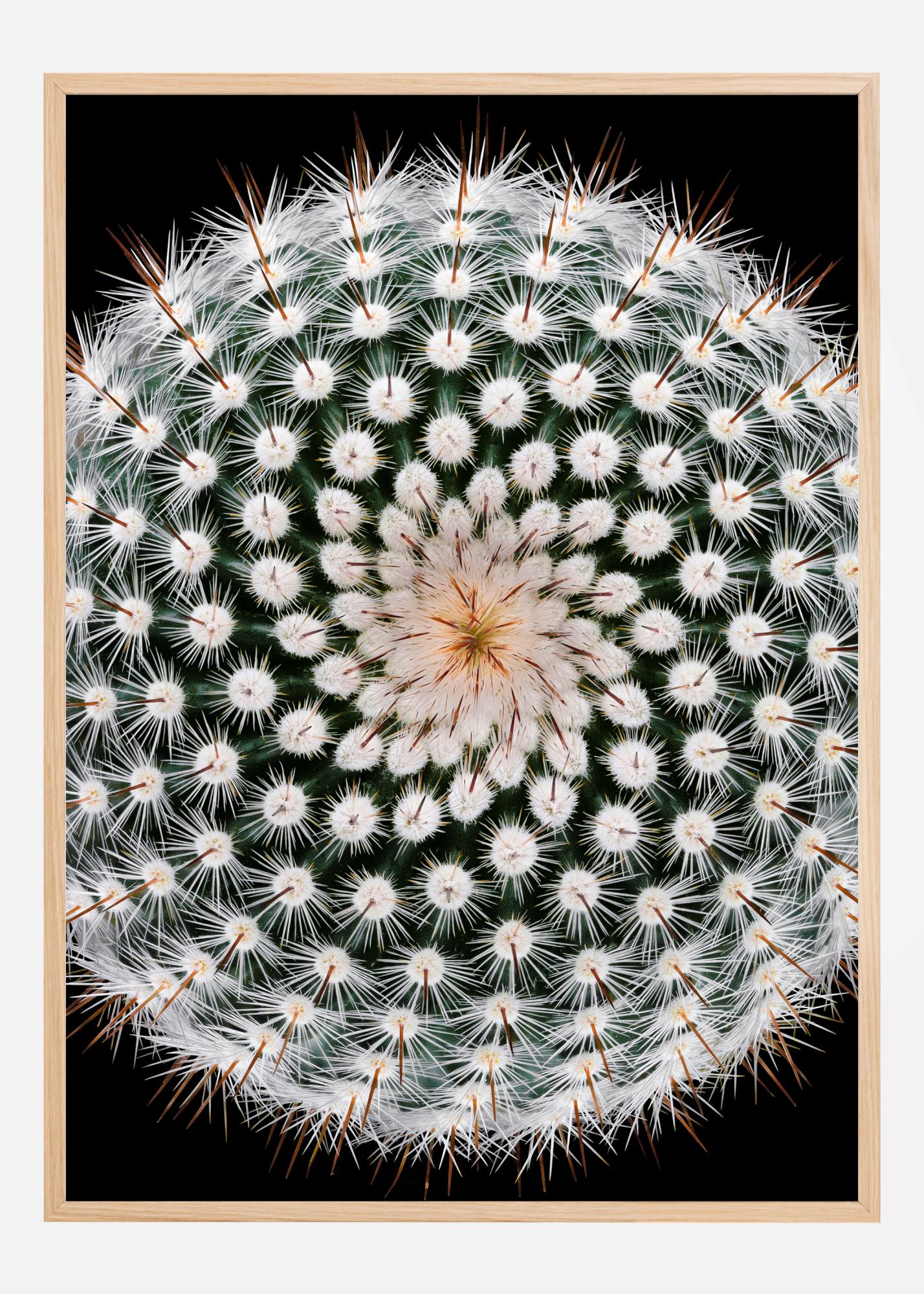 Zdjęcie lotnicze kaktusa z białymi kwiatami. Na czarnym tle ciemnozielony kolor podkreśla białe kwiaty i ostre kolce. Centralna część rośliny ma lekki żółty odcień, co dodaje koloru nadrukowi. Idealny plakat dla wszystkich miłośników roślin.
