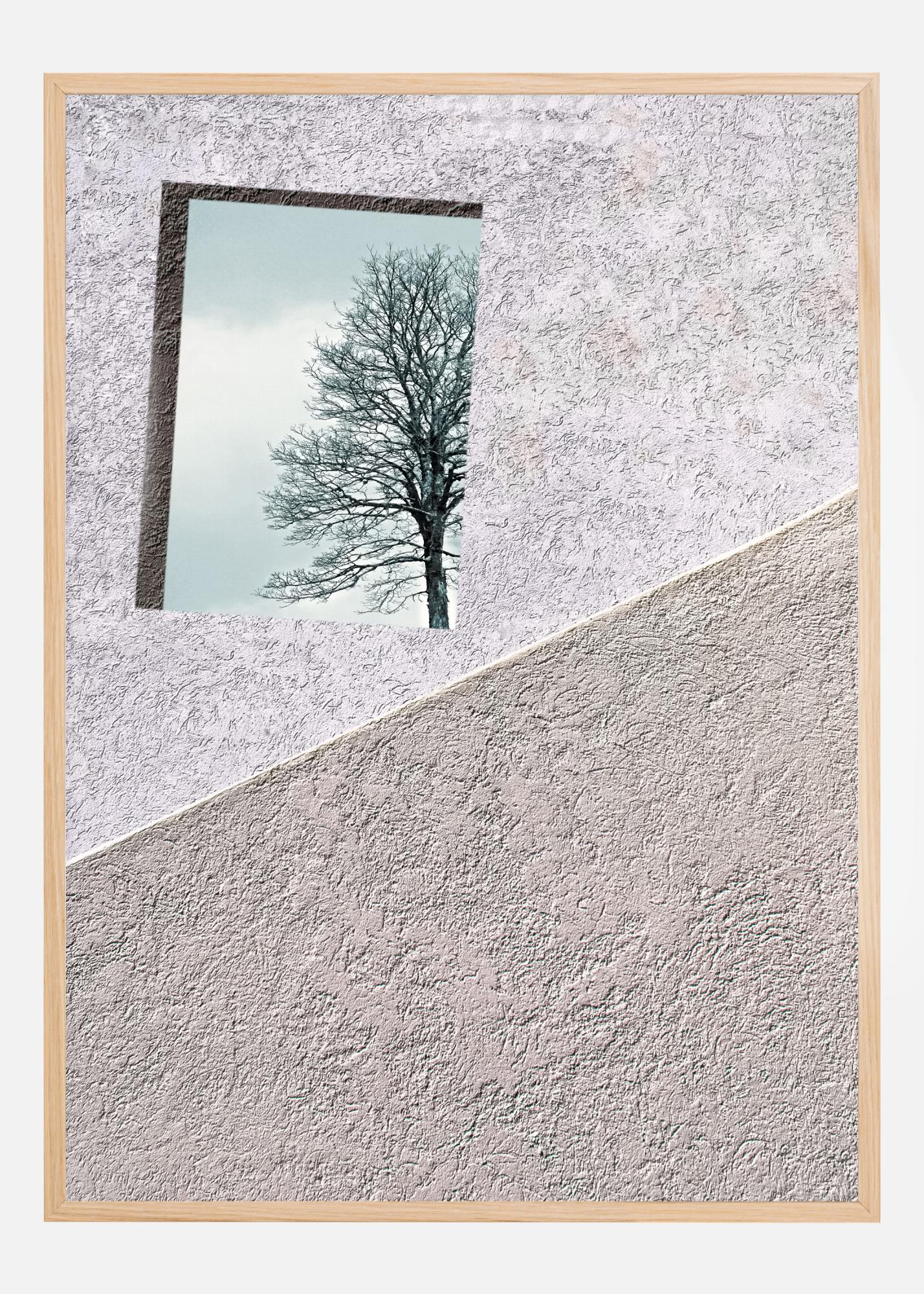 Delikatny plakat na różowej i brązowej ścianie. Grubo tynkowana ściana jest podzielona na dwie części. Po różowej stronie ściany można zobaczyć lekko zachmurzone niebo z drzewem na pierwszym planie, podczas gdy brązowa ściana jest pusta. Kreatywny obrazek do każdego nowoczesnego domu.