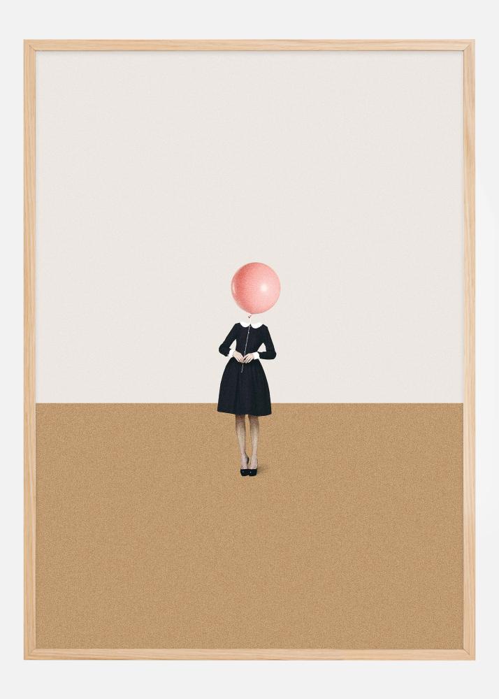 Ten artystyczny plakat przyciąga wzrok swoją prostą, ale potężną ilustracją kobiety w czarnej sukience, stojącej samotnie na tle ciepłych, piaszczystych tonów. Trzyma ona, wydaje się, idealnie sferyczną, różową bańkę nad głową, co tworzy wizualny i angażujący kontrast między osobą a otaczającą powierzchnią.