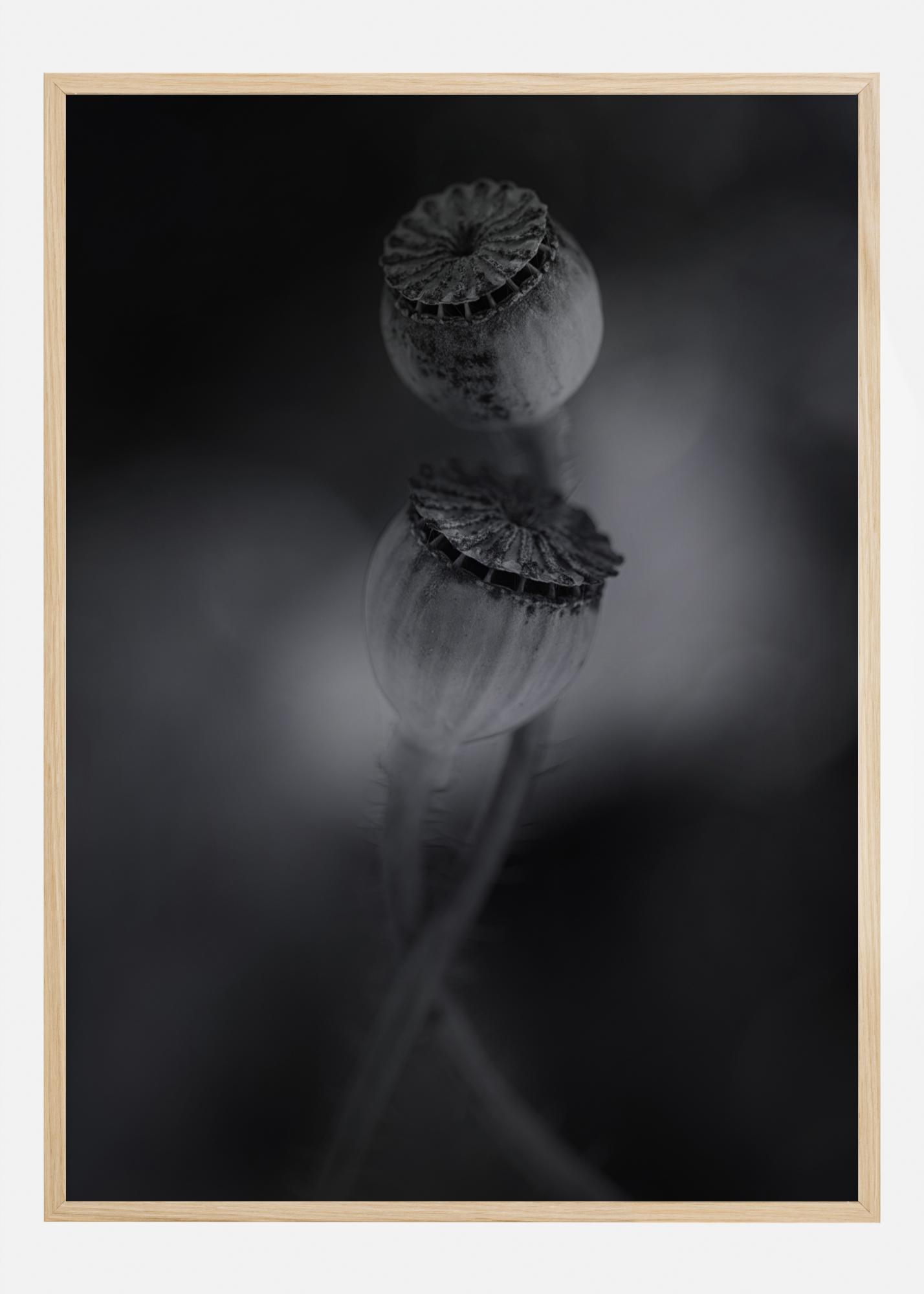 Niesamowity czarno-biały plakat zbliżeniowy z dwoma przekwitłymi kwiatami maku. Dwie torebki nasienne przeplatają się, podczas gdy naturalne światło tworzy rozmyte czarne tło. Jednocześnie światło podkreśla piękno roślin. Dodaj odrobinę spokoju do swojego domu dzięki temu wydrukowi.