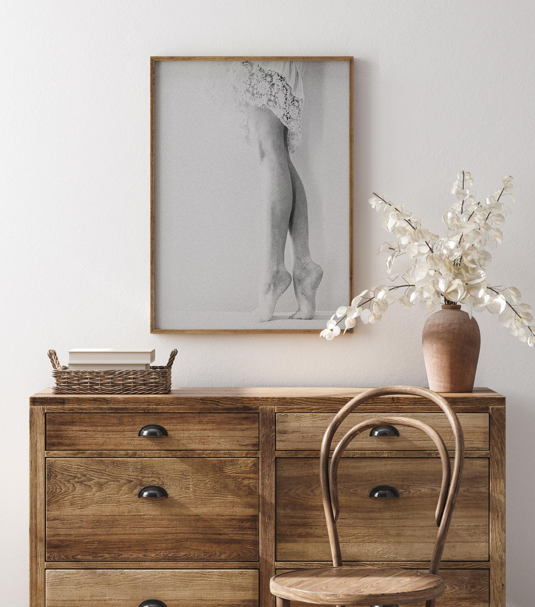 Elegancki pół-portret kobiety stojącej na palcach. Prostota obrazu w połączeniu z subtelną bielą sprawiają, że ten obraz jest doskonałym dodatkiem do sypialni lub salonu.