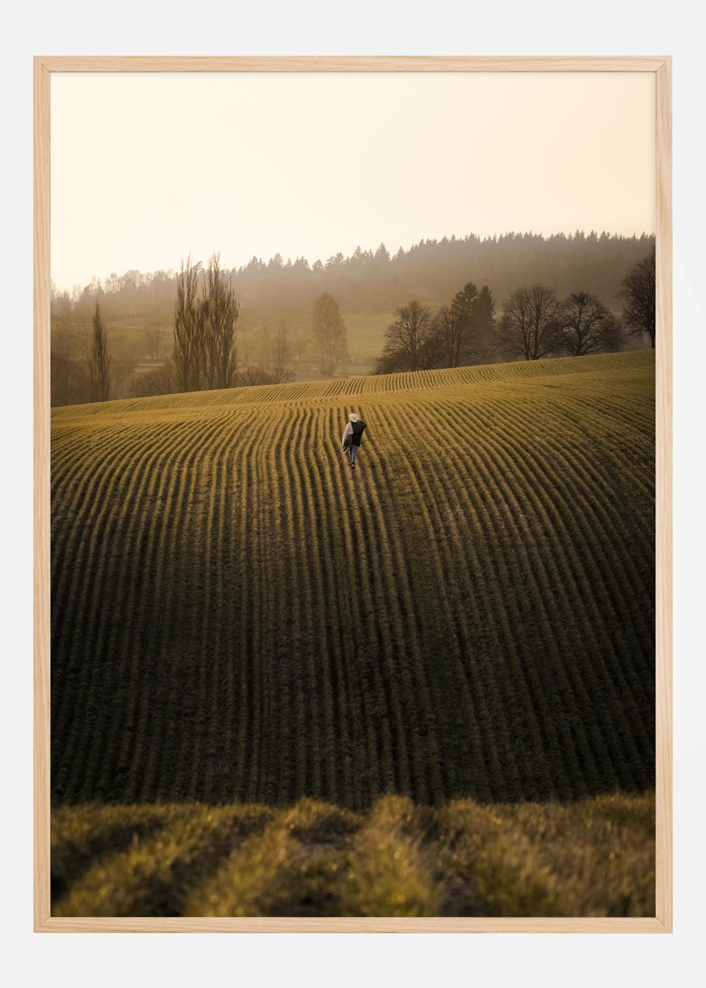 Ten plakat uchwyca istotę wiejskiej idylli w chwili spokoju i prostoty. Samotna postać wędruje wzdłuż symetrycznych pasów pola uprawnego, zatopiona w delikatnej złotej godzinie, gdy zachodzące słońce rzuca swoje ciepłe światło na krajobraz. Ten obraz oferuje medytację nad rytmem życia i zmieniającym się pięknem natury, zapraszając widza do spaceru po polu.
