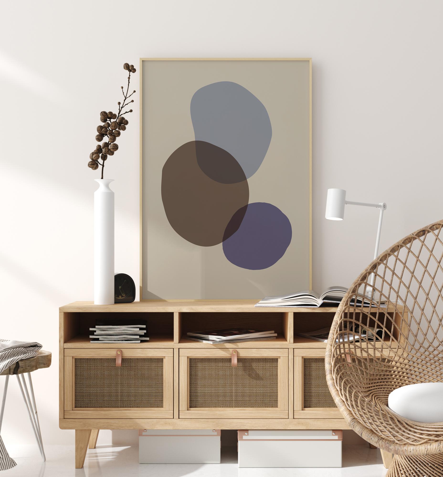 Kreatywny plakat z trzema różnokolorowymi kształtami. Na kremowym tle nachodzą na siebie brązowe, szare i fioletowe kształty. Brązowy kształt dominuje nad mniejszymi fioletowymi i szarymi kształtami. Prosty druk do powieszenia w twoim domu. Użyj swojej wyobraźni, aby zobaczyć, co przedstawiają kształty.