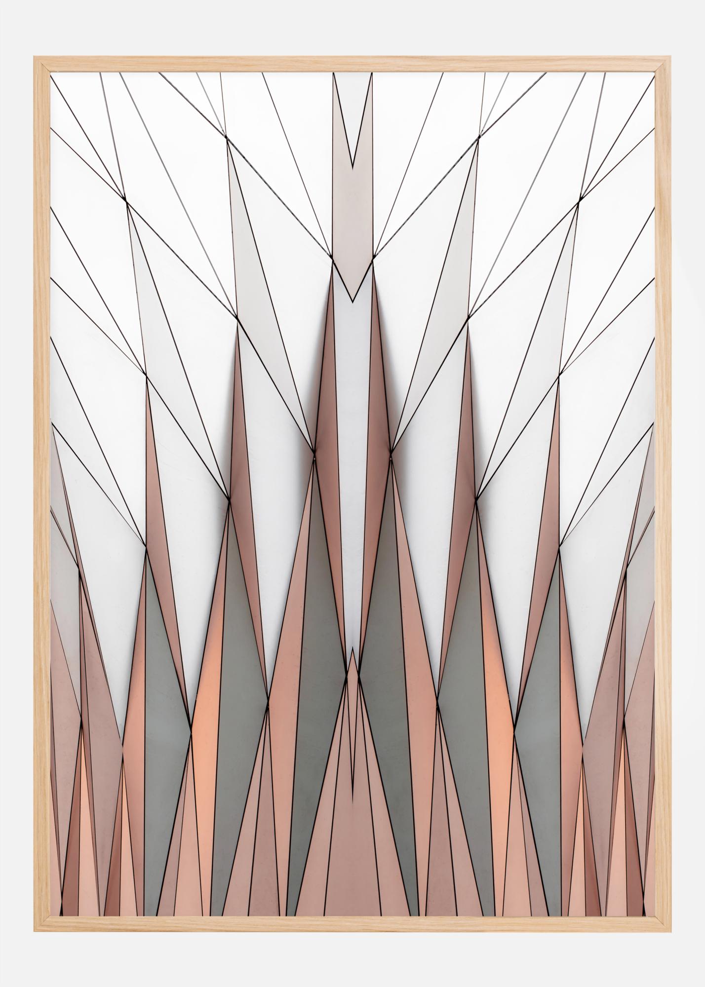 Piękny nadruk z trójkątów. Pomarańczowe i szare trójkąty są umieszczone na dole nadruku i wskazują w górę. Pozostałe trójkąty w kształcie diamentów pokrywają górną połowę nadruku. Wspaniały plakat, gdy chcesz uzyskać poczucie przestrzeni. Idealny na ścianę w salonie.