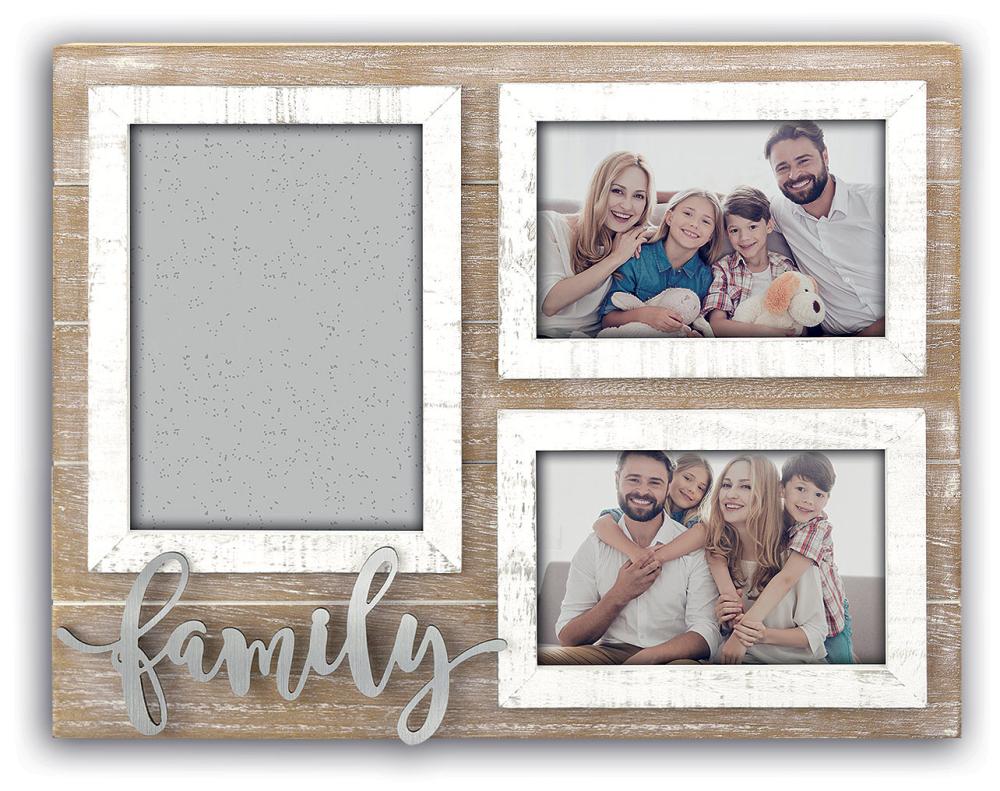 Piękna ramka kolażowa z drewna z postarzanym wyglądem, odpowiednia dla tych, którzy szukają stylu vintage do domu. Ramka ma miejsce na 3 zdjęcia o różnym rozmiarze i zdobi ją słowo "Rodzina".
