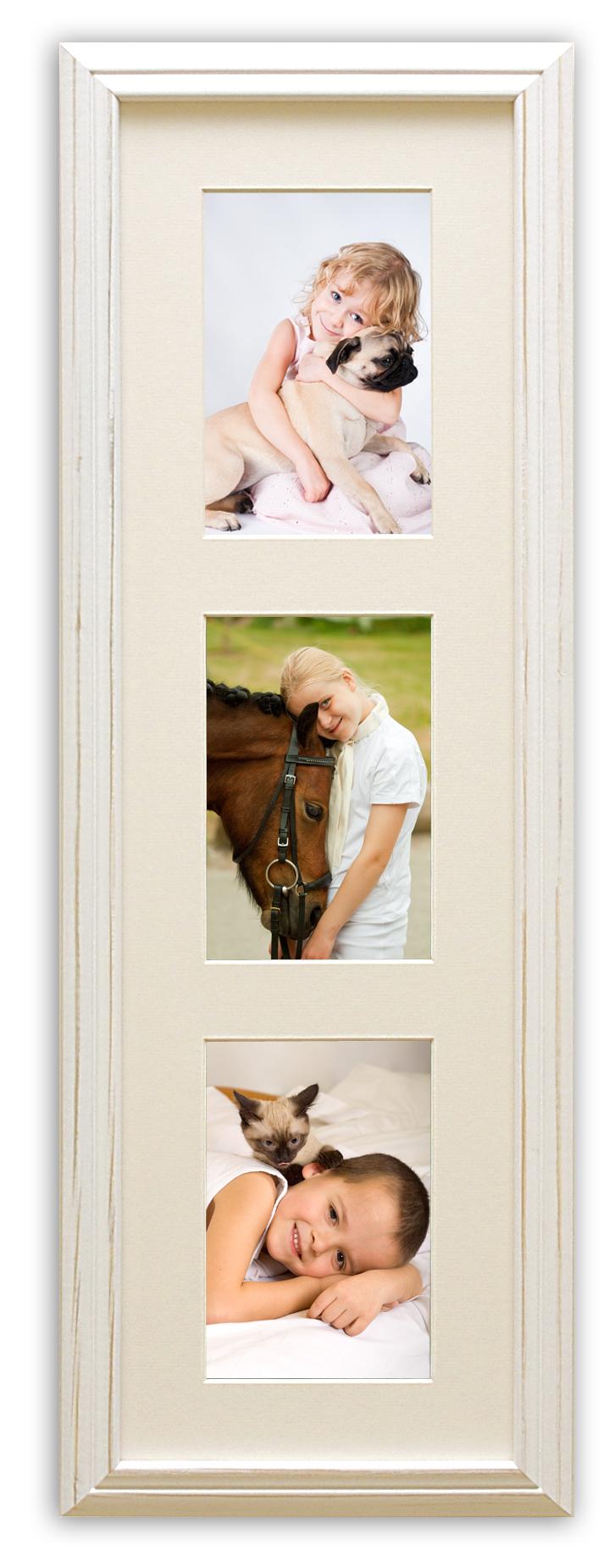 Rama kolażowa z miejscem na 3 zdjęcia z ramą drewnianą inspirowaną stylem vintage z białą podstawą i wytartymi fragmentami, gdzie widać powierzchnię drewna ramki. Nadaje to ramie jej wyjątkowy charakter.