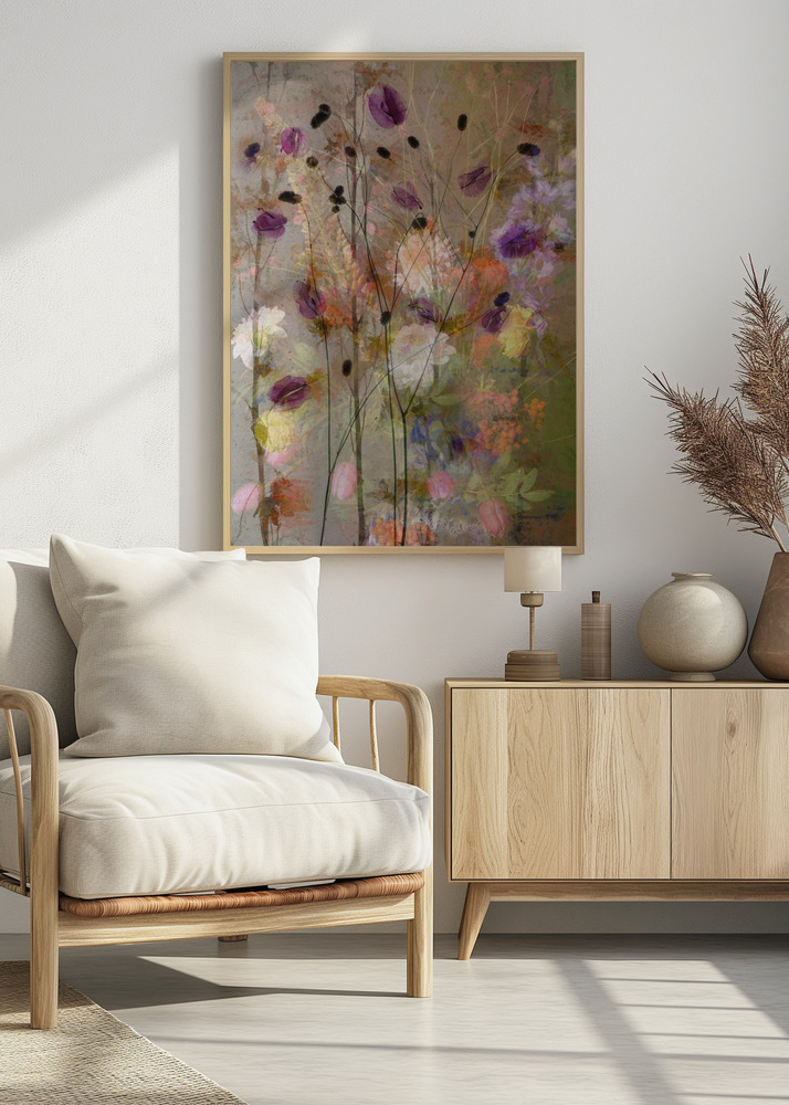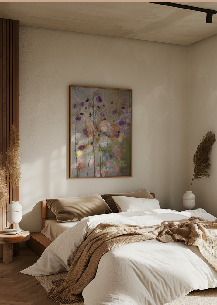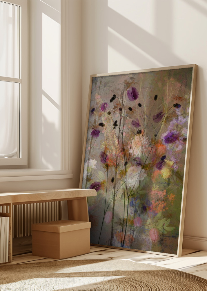 Fantastyczny ręcznie malowany druk przedstawiający fioletowe i białe suszone kwiaty. Na beżowym tle naturalne kolory kwiatów tworzą relaksującą atmosferę. Miękkie zielone, fioletowe i pomarańczowe odcienie są bardzo delikatne dla oka. Piękny plakat, który pasuje obok twojej toaletki.