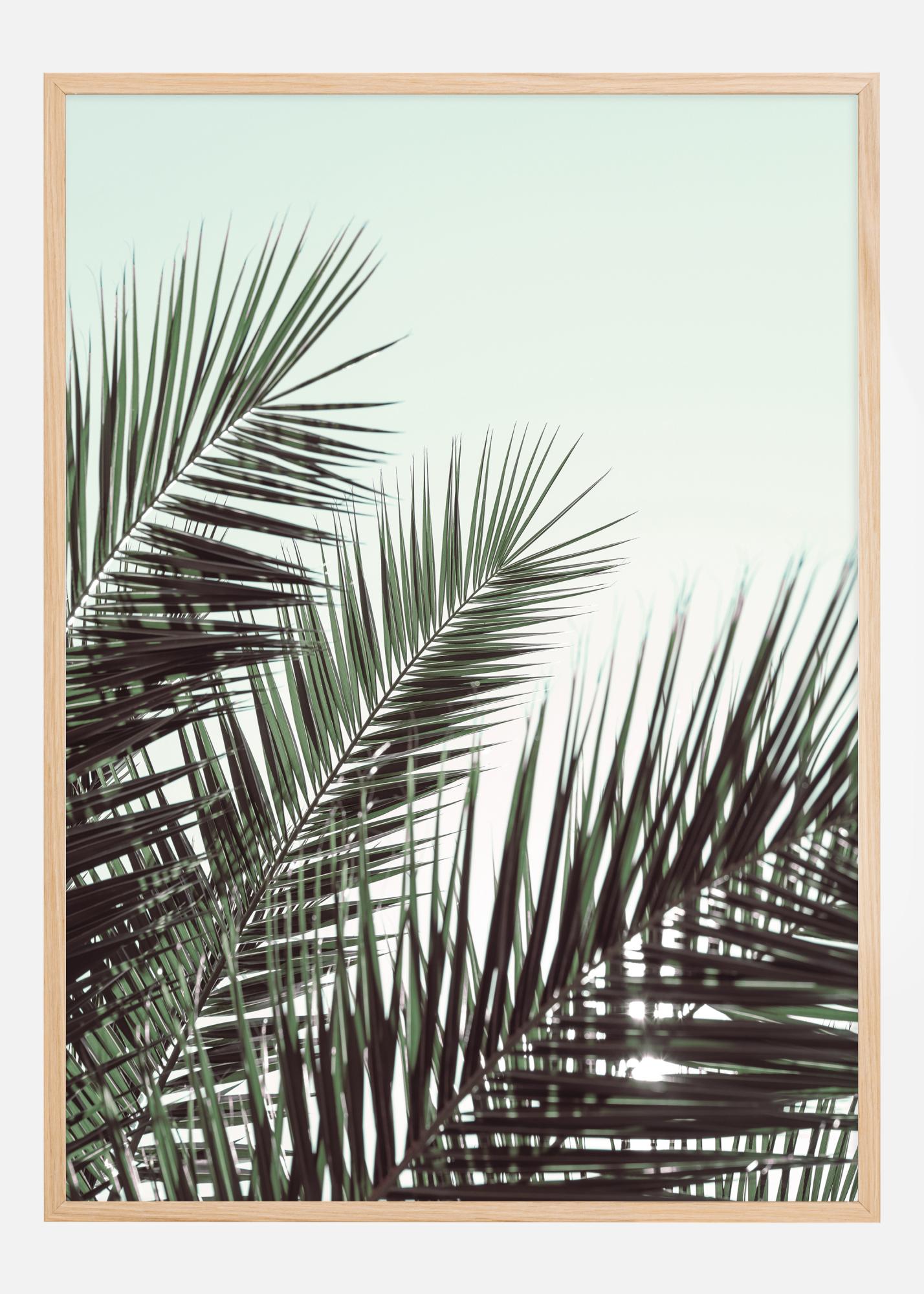 Zamień swój dom w tropikalną oazę dzięki tej wyrafinowanej grafice przedstawiającej bujne liście palmowe na pastelowym niebie. Ten plakat uchwyca lekki powiew i spokój, który można odnaleźć tylko w ciepłym klimacie. Szczegółowo przedstawione zielone liście są pięknie ukazane na tle miękkiego niebieskiego nieba, tworząc poczucie wiecznego lata i natury w Twojej przestrzeni.
