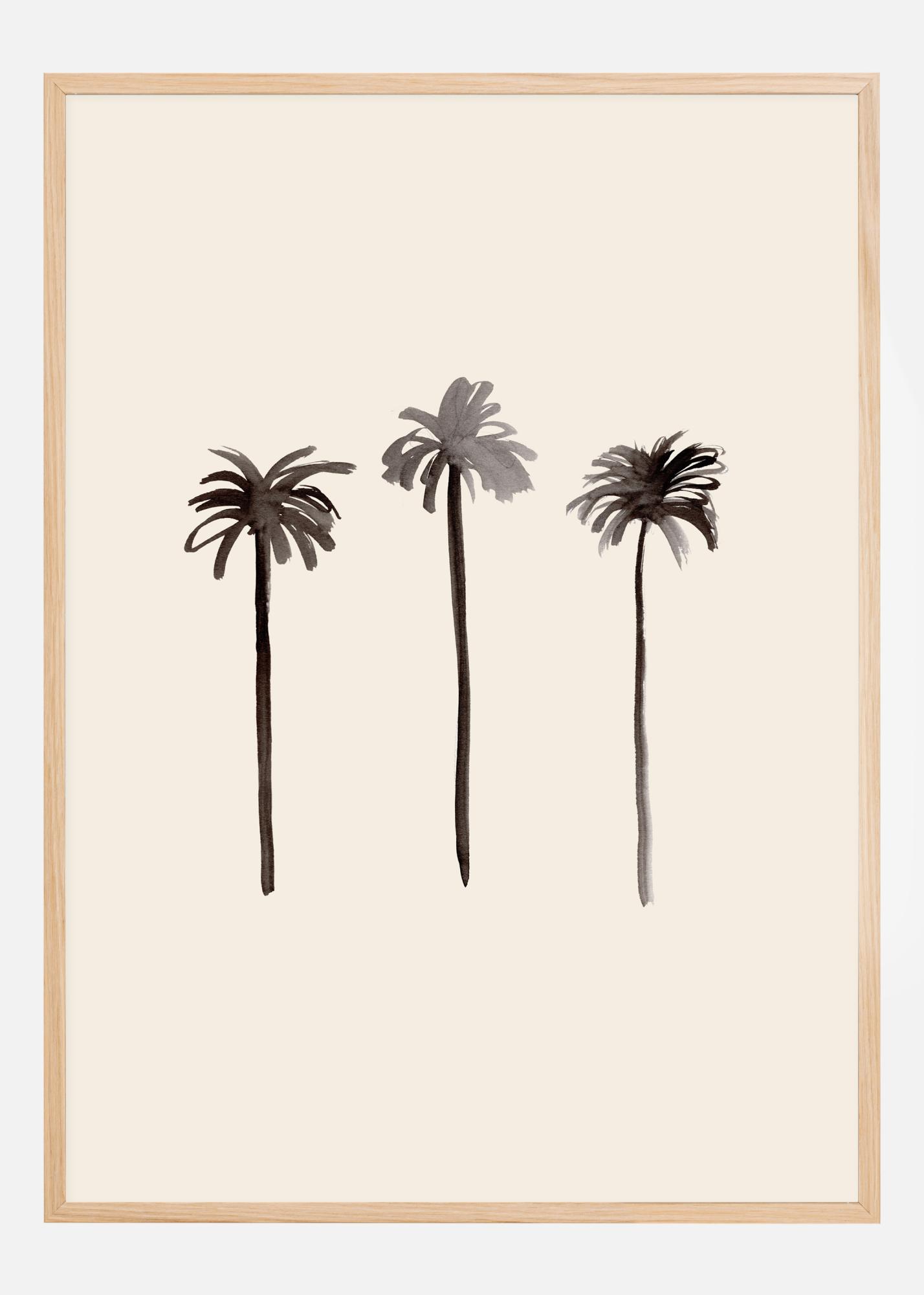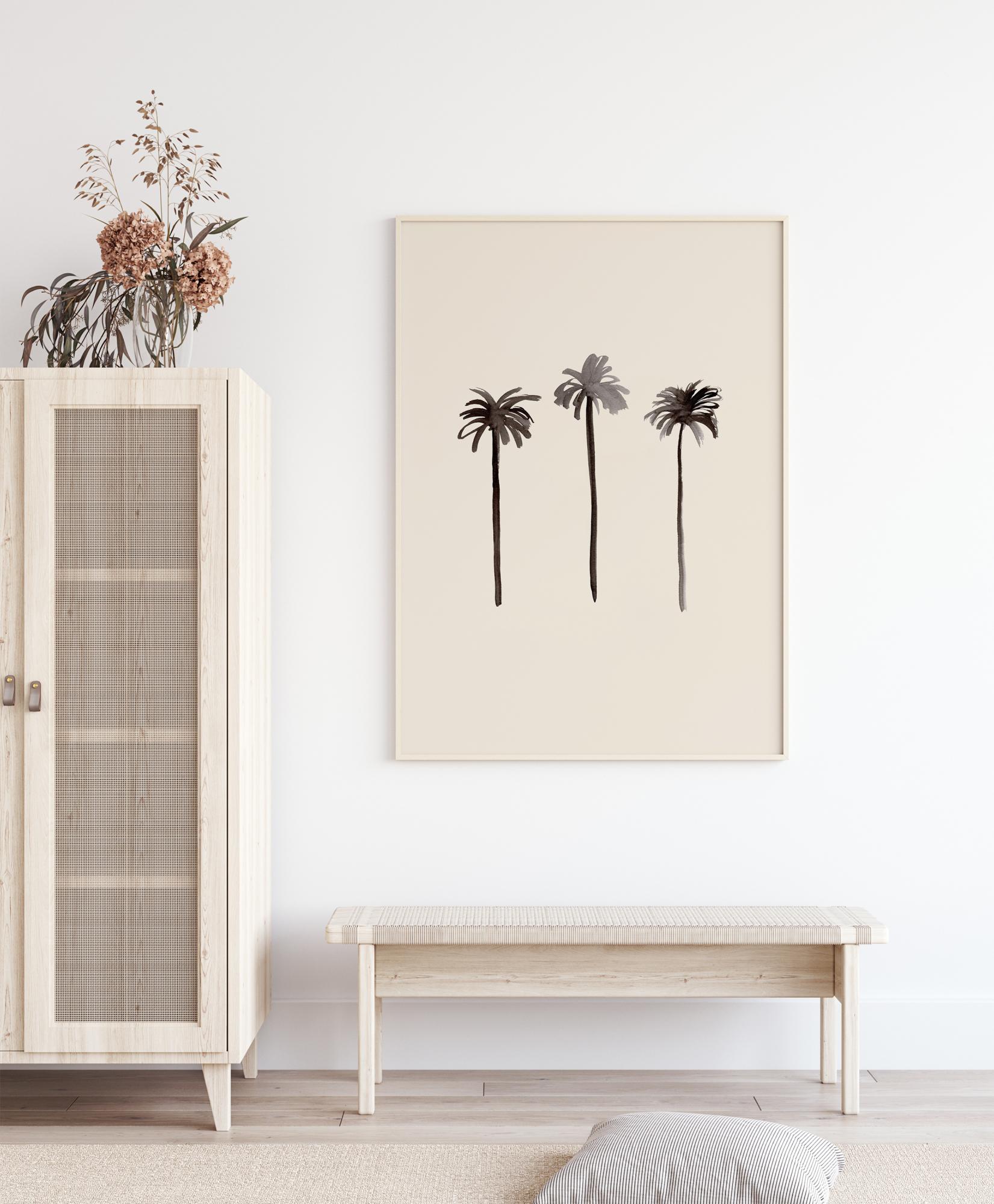 Prosty czarno-biały nadruk ręczny z trzema palmami w rzędzie. Na beżowym tle użyto różnych odcieni czerni, aby stworzyć cień na liściach. Prosty plakat, który pasuje do zawieszenia na ścianie w salonie.