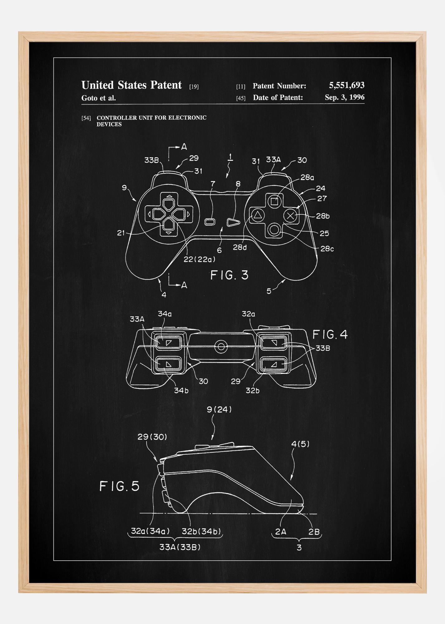 Ten plakat patentowy przedstawia szczegółowy rysunek kontrolera do Playstation, numer patentu 5,551,693, datowany na 3 września 1996, na efektownym czarnym tle. Każdy przycisk i joystick jest starannie zilustrowany, aby pokazać ergonomiczną konstrukcję kontrolera i funkcje zorientowane na użytkownika. Ta przełomowa koncepcja miała znaczący wpływ na projektowanie kontrolerów gier, które pojawiły się później, i przyczyniła się do kształtowania doświadczeń z grami, które znamy dzisiaj.