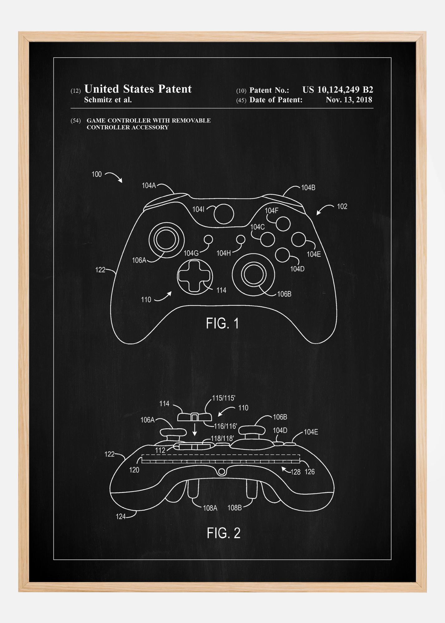 Ten plakat patentowy z czarną tablicą w tle elegancko podkreśla nowoczesny kontroler do Xbox z odłączanym akcesorium, numer patentowy US 10,124,249 B2, datowany na 13 listopada 2018. Zaawansowany projekt i jego komponenty są wizualnie przedstawione w detalach, co daje wgląd w to, jak technologia i doświadczenie w grach mogą być dostosowane do użytkownika. Jest to manifestacja ciągłej innowacji zachodzącej w świecie kontrolerów do gier.