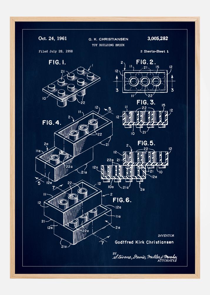 Ten szczegółowy plakat patentowy przedstawia genialny projekt klocka konstrukcyjnego z Lego, który zmienił sposób kreatywnej zabawy i nauki, stworzony przez Godtfreda Kirka Christiansena. Z numerem patentowym 3,005,282, przyznanym 24 października 1961 roku, ta ilustracja uchwyca istotę wynalazku, który inspirował i cieszył pokolenia budowniczych i myślicieli.