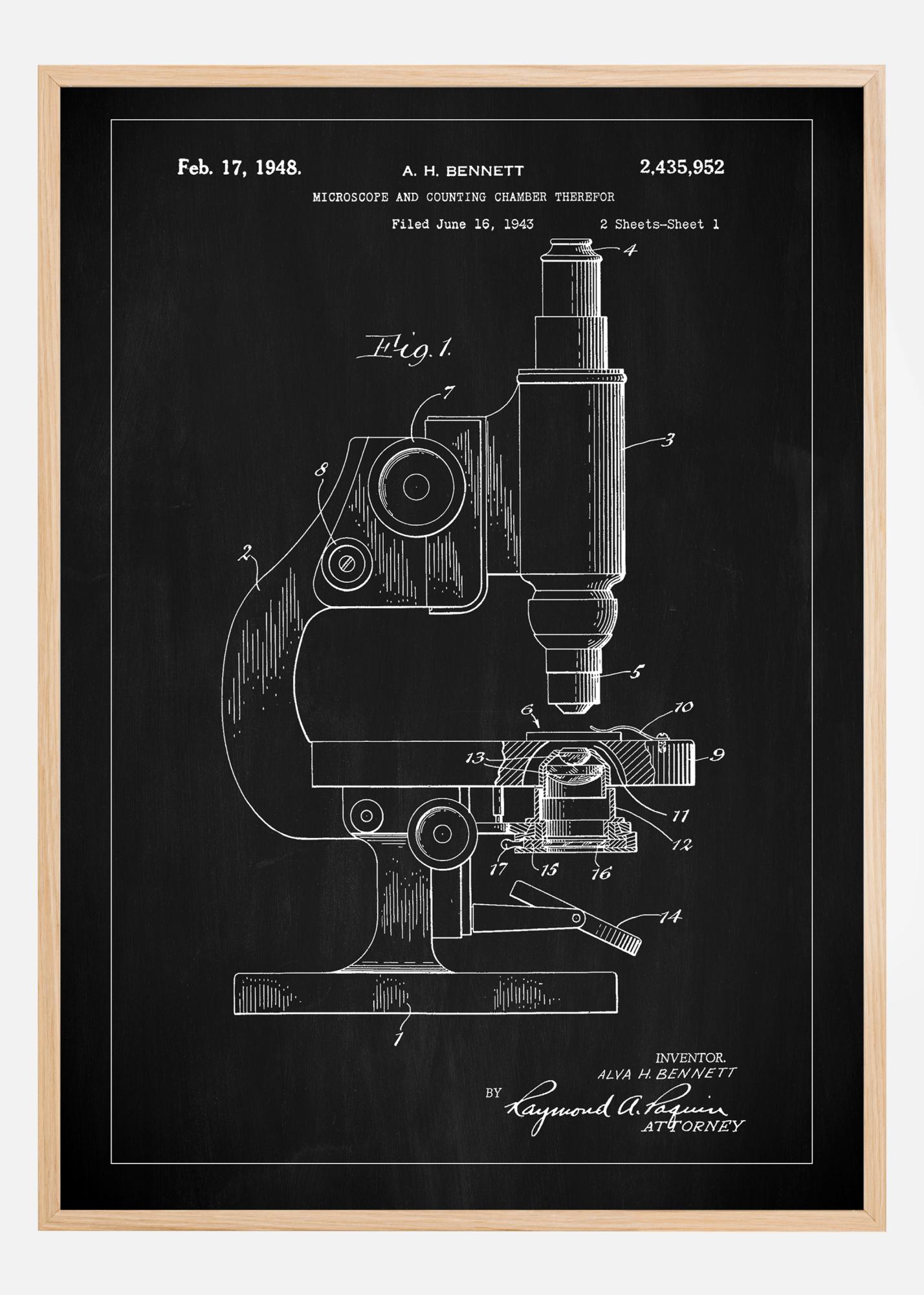 Ten plakat patentowy przedstawia wyrafinowane tło w kolorze czarnej tablicy, które elegancko eksponuje klasyczny rysunek patentowy mikroskopu z dnia 17 lutego 1948 roku. Białe linie na ciemnym tle tworzą dramatyczny efekt i ilustrują konstrukcję mikroskopu oraz innowacyjne cechy jego komory zliczającej. Jest to ikoniczne przedstawienie naukowej precyzji i piękna funkcjonalnego designu.