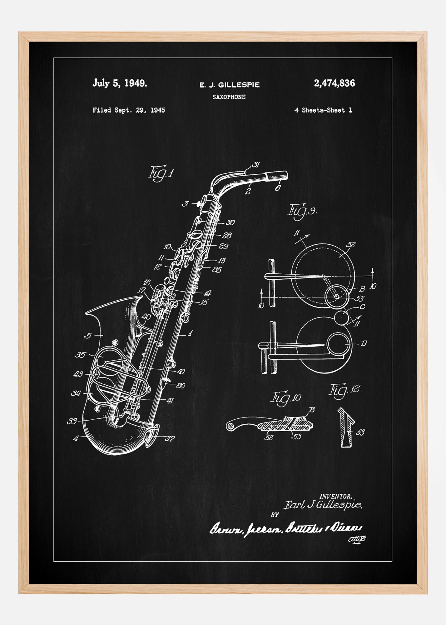 Ten elegancki plakat patentowy podkreśla estetycznie pociągający i skomplikowany instrument, jakim jest saksofon, z szczegółowym rysunkiem patentowym datowanym na 5 lipca 1949. Każda część instrumentu jest starannie zilustrowana i ponumerowana, co daje fascynujący wgląd w jego konstrukcję mechaniczną i design. Ten unikalny plakat patentowy byłby doskonałym dodatkiem do wystroju studiów muzycznych, salonów lub biur, gdzie muzyka i design są cenione.
