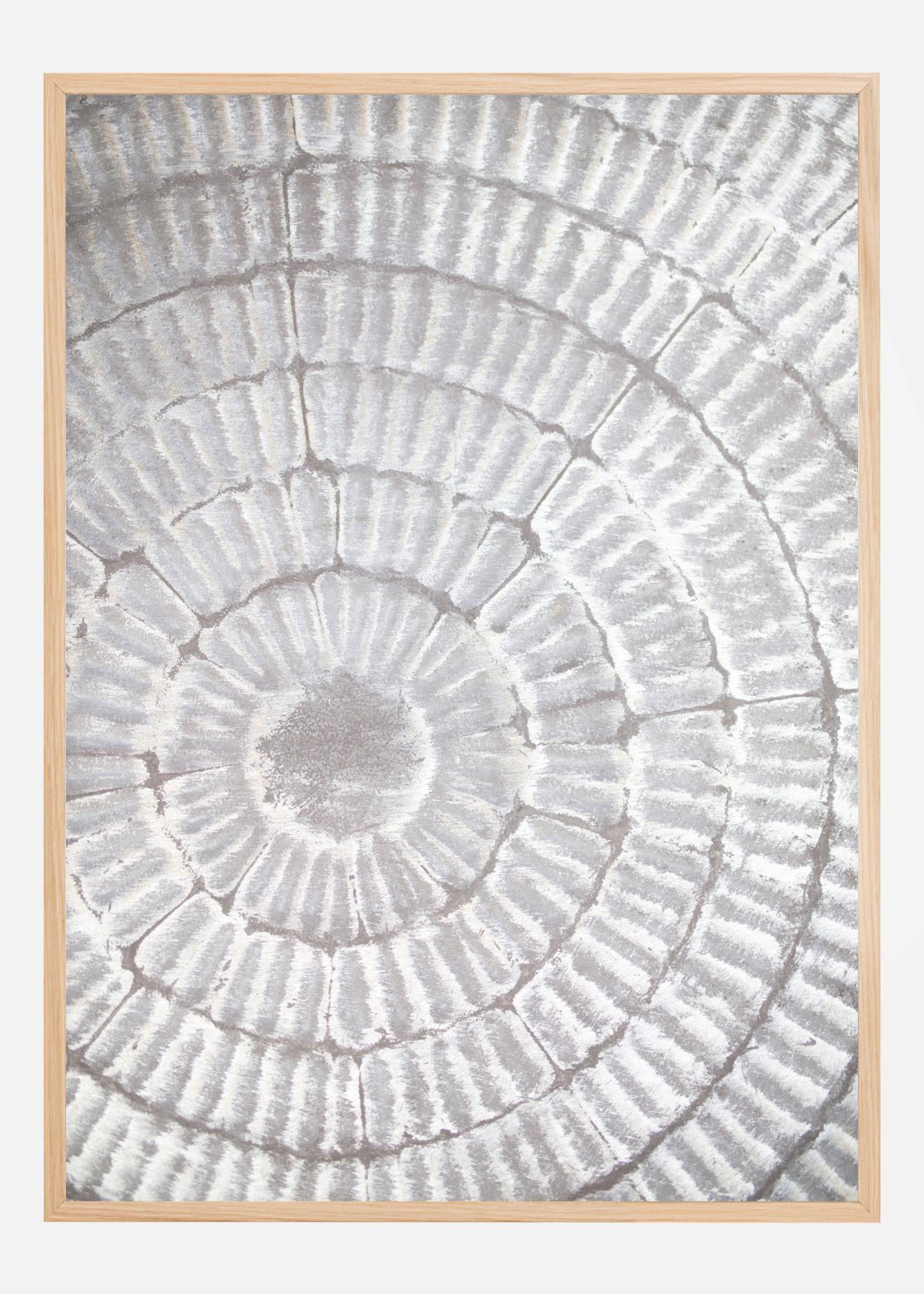 Szklany plakat z szarym wzorem na płytce. Okrągłe beżowe i białe pierścienie tworzą żebrowany wygląd na płytce, która tworzy idealnie gładkie koło w środku. Ze swoimi miękkimi, kojącymi kolorami ten uroczy obraz tworzy spokojną mistykę. Idealny do powieszenia na kolorowej ścianie.