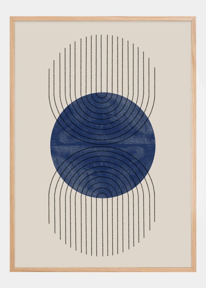 Ten minimalistyczny i abstrakcyjny plakat przedstawia głęboko niebieski okrąg skoncentrowany wewnątrz serii pionowych linii, które tworzą iluzję ruchu i wymiaru. Dzieło sztuki bawi się optycznym doświadczeniem perspektywy i głębi poprzez powtarzający się wzór, co sprawia, że niebieski okrąg wydaje się pulsować lub wibrować. Stonowana kolorystyka składa się z głębokiego błękitu na neutralnym tle, co podkreśla czyste linie i prostotę piękna projektu.