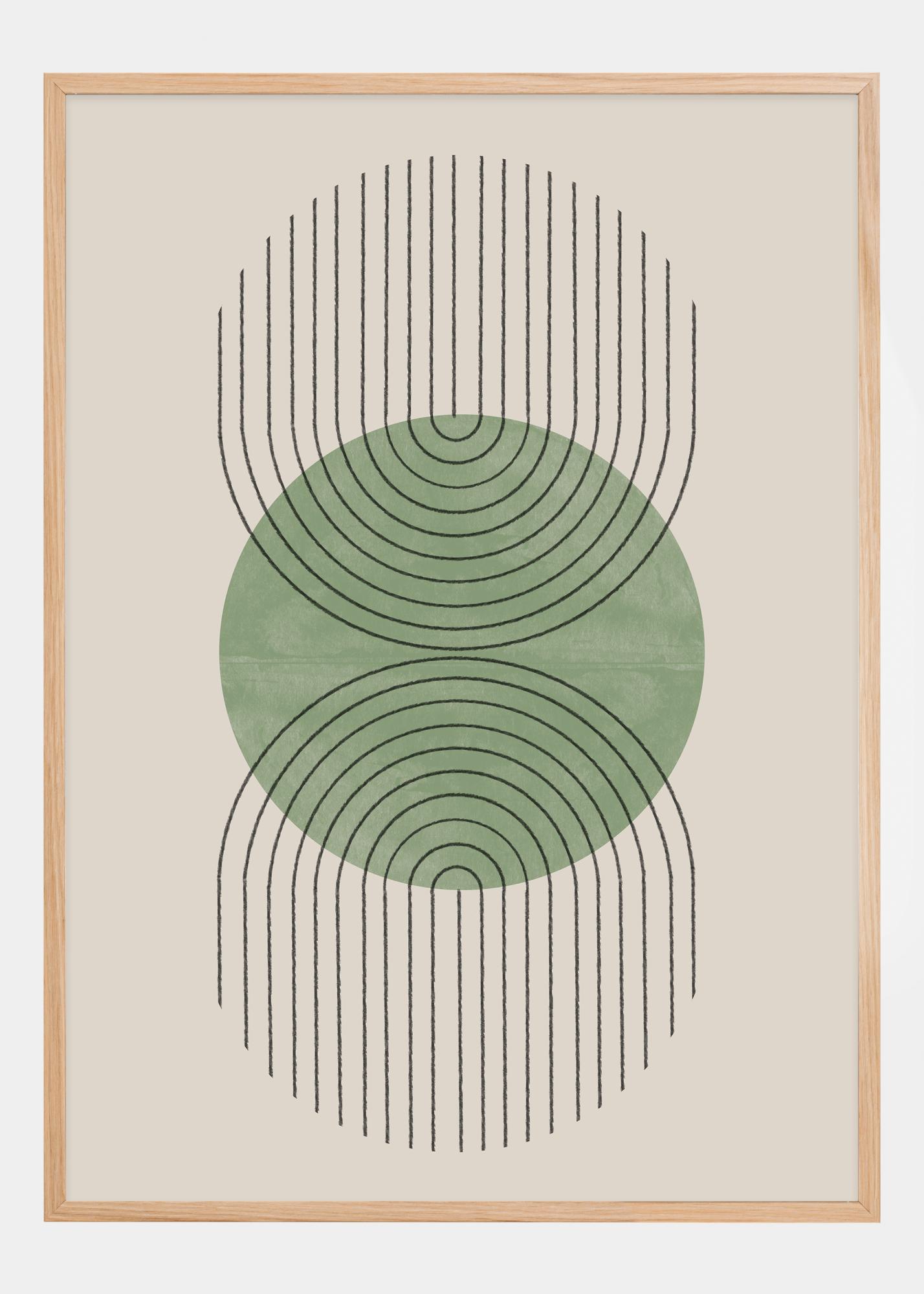 Ten plakat to minimalistyczne dzieło sztuki, które podkreśla nasyconą zieloną okrągłą formę otoczoną serią czarnych linii, co daje wrażenie przestrzeni i głębi. Zielony odcień koła zmienia intensywność, tworząc wizualny efekt wymiaru i tekstury. Linie, które rozciągają się na zewnątrz od krawędzi koła, tworzą niemal hipnotyczny efekt i przedstawiają geometryczną harmonię.