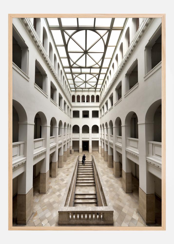 Wspaniały plakat z budynkiem Petera Behrensa. Beżowe i białe wnętrze uchwyca postać wchodzącą po schodach. Przezroczysty dach oświetla detale architektury z okrągłymi i kwadratowymi oknami, które przepuszczają światło. Stwórz stylową atmosferę z tym fantastycznym wydrukiem.