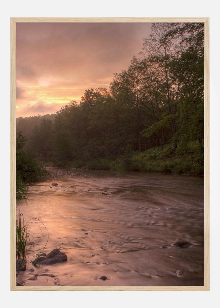 Niesamowita grafika przedstawiająca błotnistą rzekę płynącą przez las. Pomarańczowe wieczorne słońce zanurza się wśród chmur, dodając zdjęciu subtelny pomarańczowy akcent. Powieś ten magiczny plakat w salonie i podążaj za nurtem.