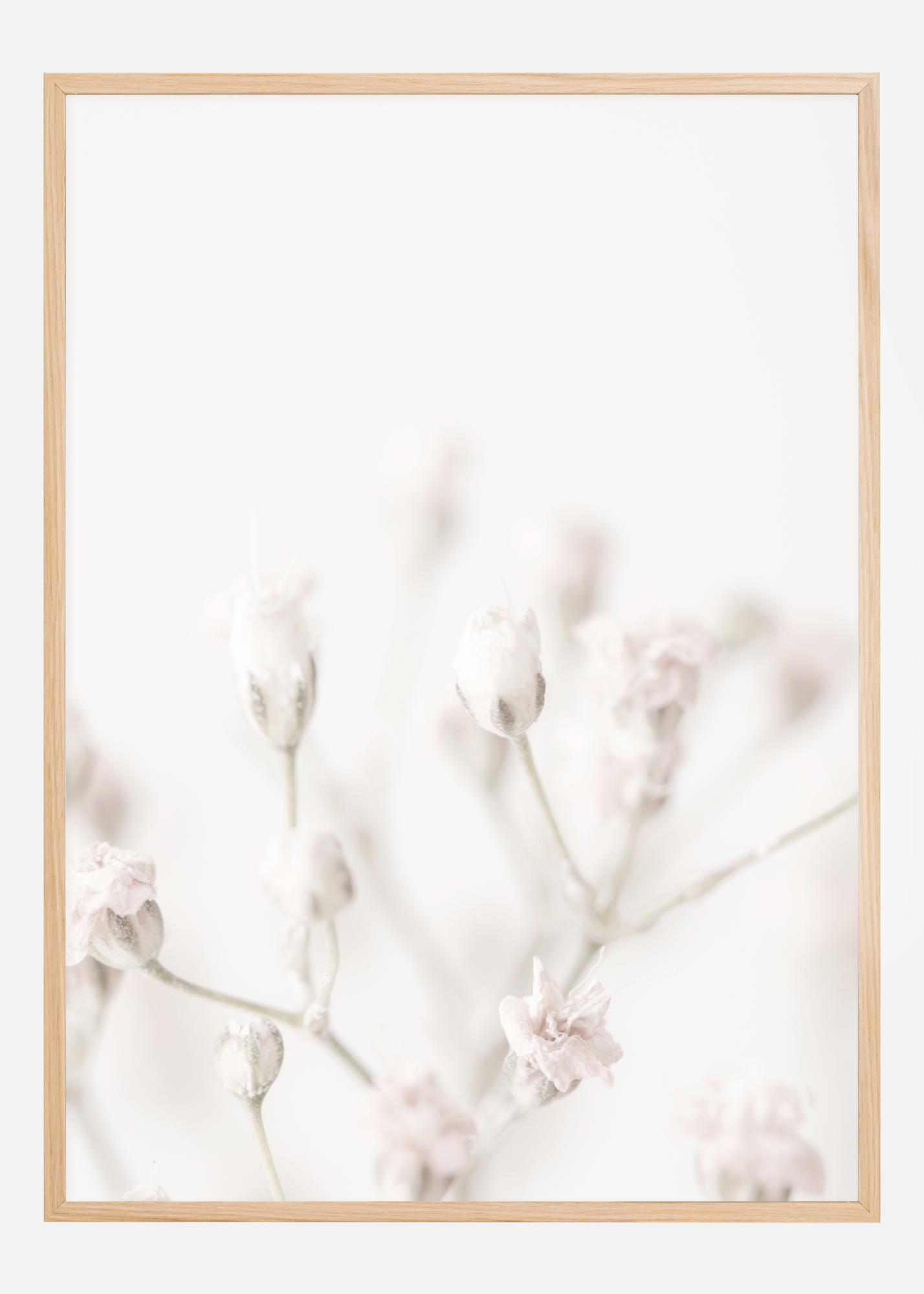 Zachwycający plakat z bliska przedstawiający małe różowe kwiaty, które dzielnie znoszą biały opad śniegu. Dzięki rozmytemu białemu tłu kwiaty są tylko delikatnie widoczne dzięki swoim miękkim różowym płatkom. Wprowadź zimowy krajobraz do swojego domu za pomocą tego wspaniałego nadruku.