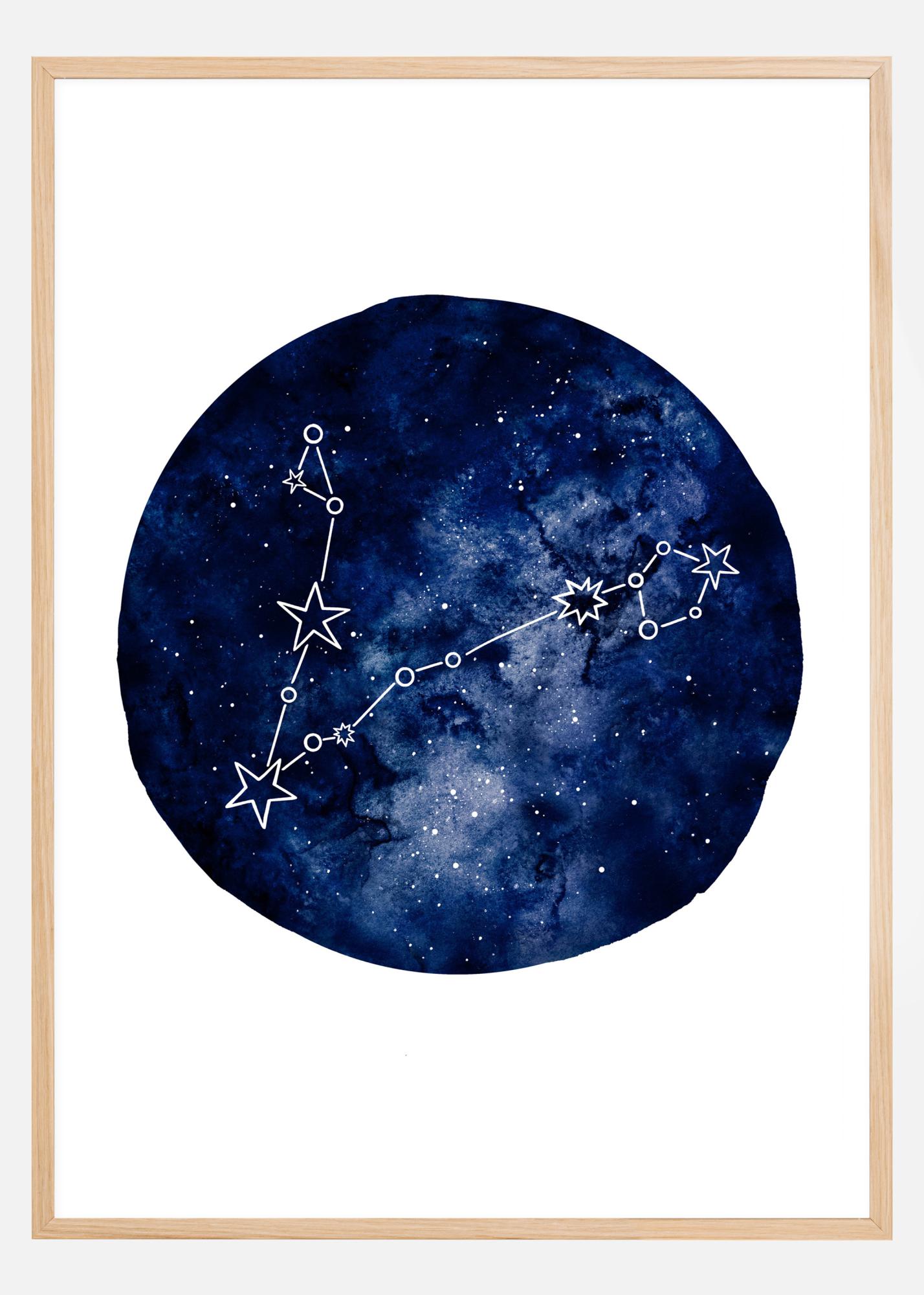 Imponujący astrologiczny wydruk ilustrujący znak zodiaku Ryby. Na białym tle ciemnoniebieski obraz konstelacji został wyraznie podkreślony białymi pięcioma gwiazdami. Fascynujący plakat dla wszystkich zainteresowanych astrologią lub astronomią. Doskonały wydruk do powieszenia w twoim gabinecie.