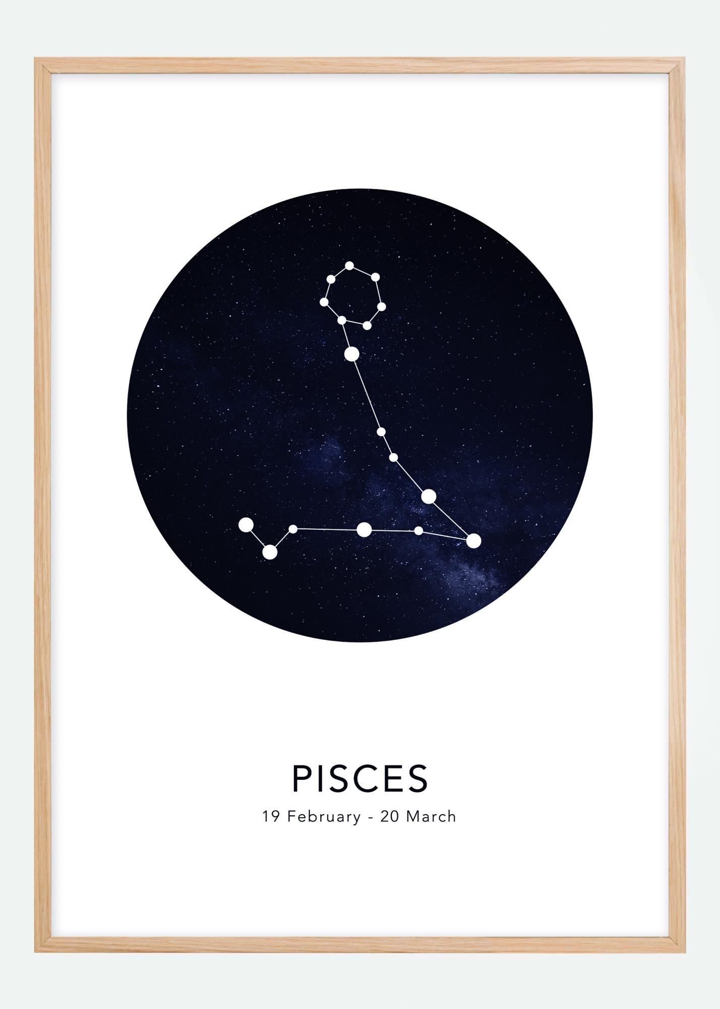Podaruj osobistą grafikę komuś, kogo lubisz! Ta elegancka plakat przedstawia znak zodiaku Ryby na tle w postaci czarnego i niebieskiego nieba pełnego gwiazd. Poniżej znajduje się nazwa wraz z odpowiednimi datami po angielsku.