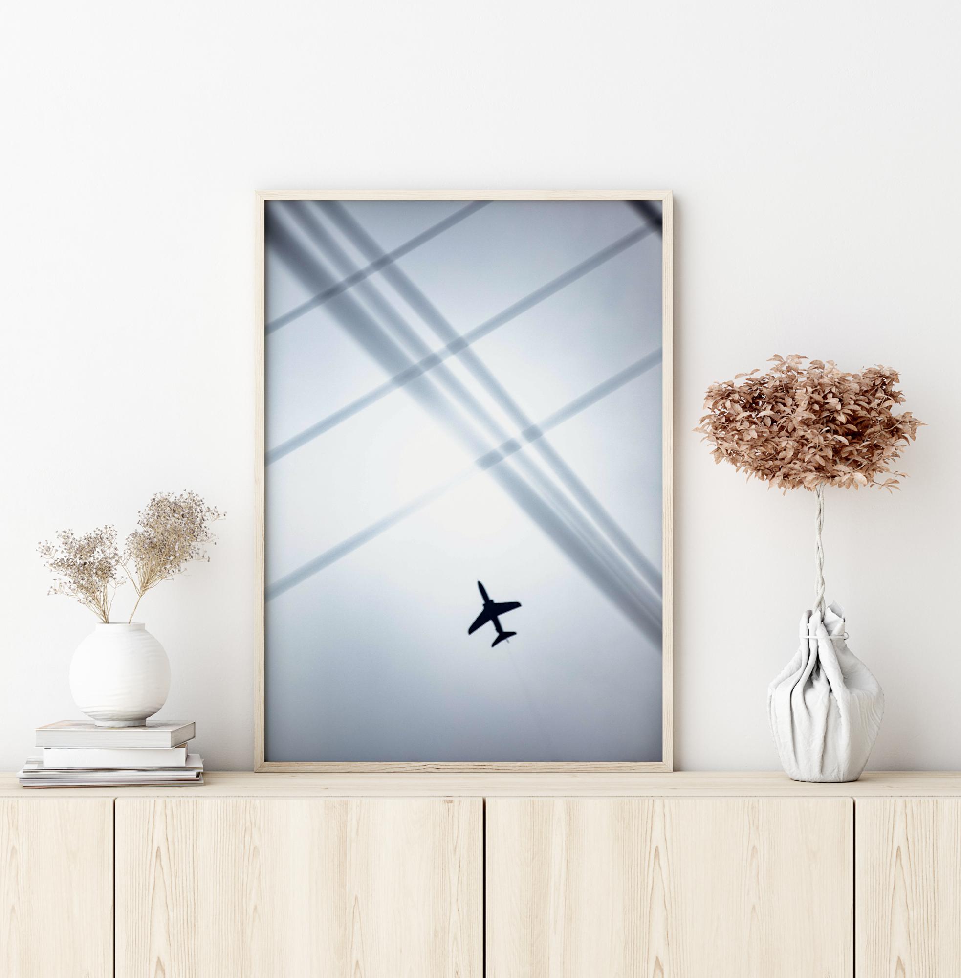 Żabia perspektywa samolotu przelatującego nad nami. Silne światło słoneczne podkreśla samolot, gdy zmierza w nieznanym kierunku. Czarne równoległe linie nadają wydrukowi odrobinę koloru. Zgadnij końcowy cel samolotu, gdy zawiesisz plakat w swoim domu.
