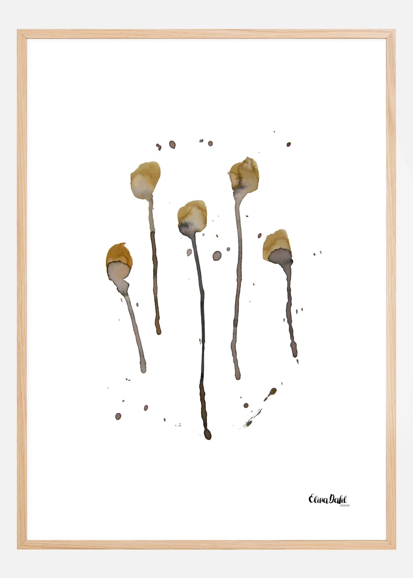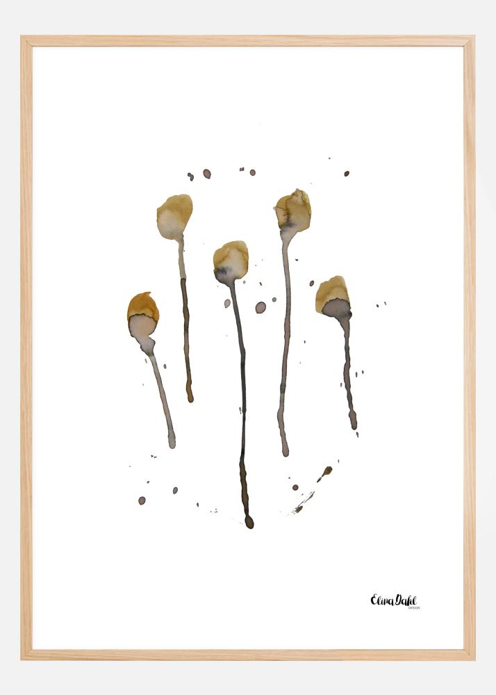 Botaniczny nadruk z pięcioma małymi łodygami kwiatów. Umieszczone na białym tle, pięć brązowych i szarych łodyg kwiatów stoi prosto pośrodku plakatu. Brązowe plamy farby otaczają łodygi losowo. Wspaniały plakat dla wszystkich miłośników roślin.