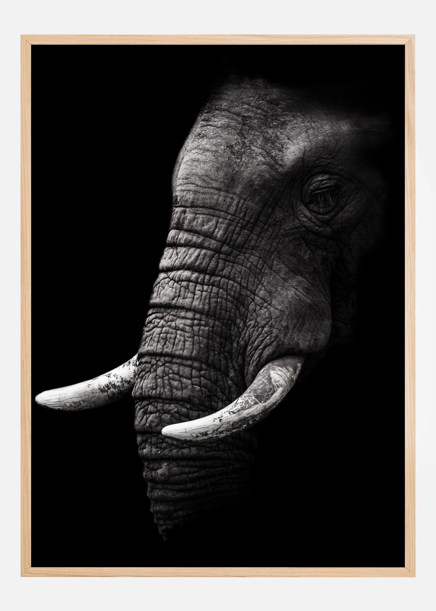 Fantastyczny czarno-biały nadruk głowy słonia. Czarne tło podkreśla małe kły słonia. Z małą pomarszczoną trąbą i zamkniętymi oczami, obraz jest stylową reprezentacją piękna słonia. Idealny plakat dla miłośników zwierząt.