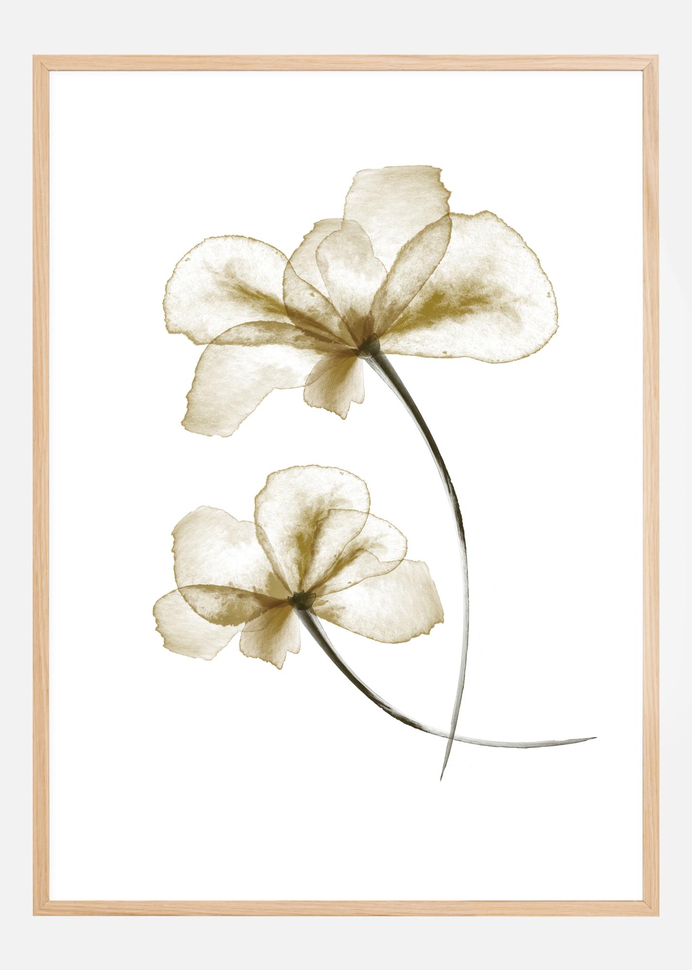 Atrakcyjny, ale prosty plakat z dwoma białymi kwiatami na białym tle. Na dole wydruku kwiaty pięknie się ze sobą przeplatają, co nadaje wydrukowi subtelny charakter. Przezroczystość w miękkich brązowych i beżowych tonacjach wyglądałaby idealnie na ścianie w kolorze kremowym.