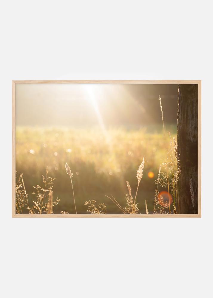 Plakat z fotografią w sepii przedstawiającą letnią łąkę pod światło z trawami w stadium nasiennym na pierwszym planie. Motyw jest spokojny i można niemal usłyszeć dźwięki koników polnych w ciepły letni wieczór. Plakat dobrze komponuje się z każdą aranżacją wnętrz dzięki stonowanej kolorystyce i pięknie wygląda powieszony w zestawieniu z innymi motywami natury.