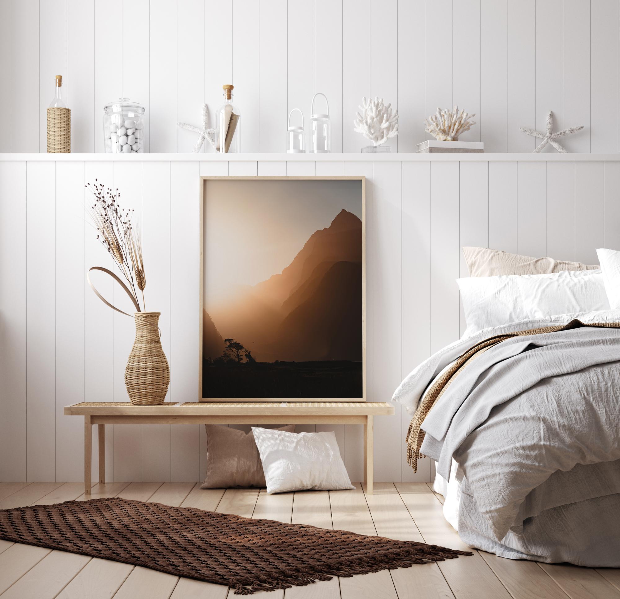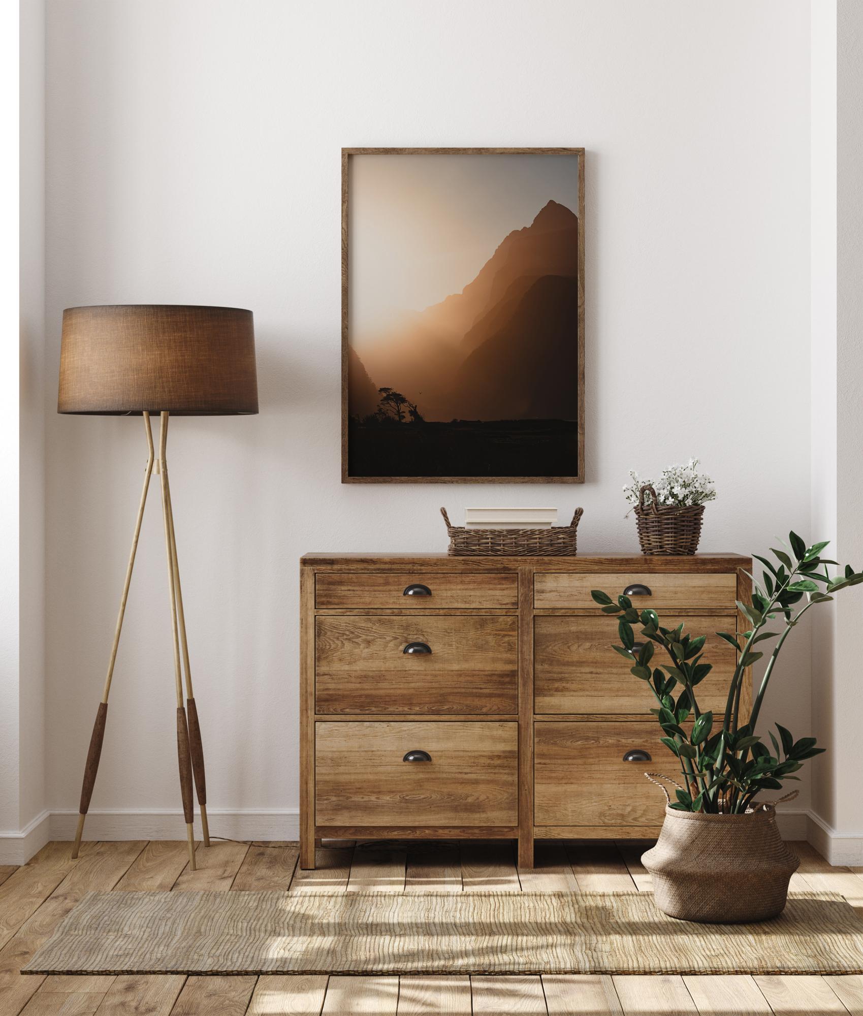 Piękny, malowniczy plakat z krajobrazem o zachodzie słońca. Przestrzeń między wzgórzami świeci jasnymi, oślepiającymi promieniami, tworząc ciemne tło. Odległe drzewa i ptak manifestują istnienie życia. Ozdób swoją sypialnię tym żywiołowym obrazem.