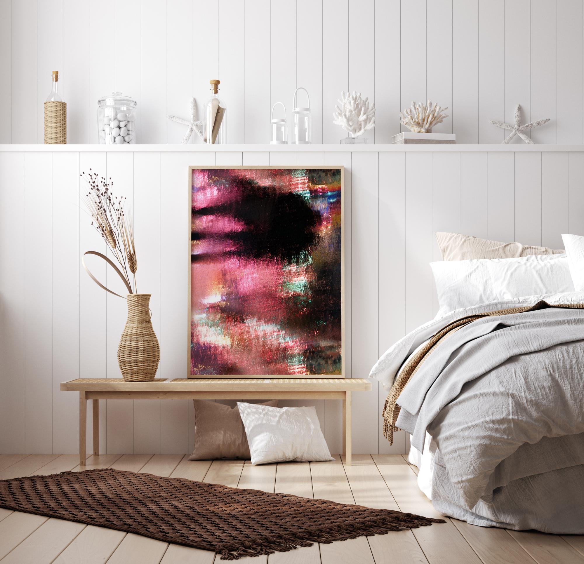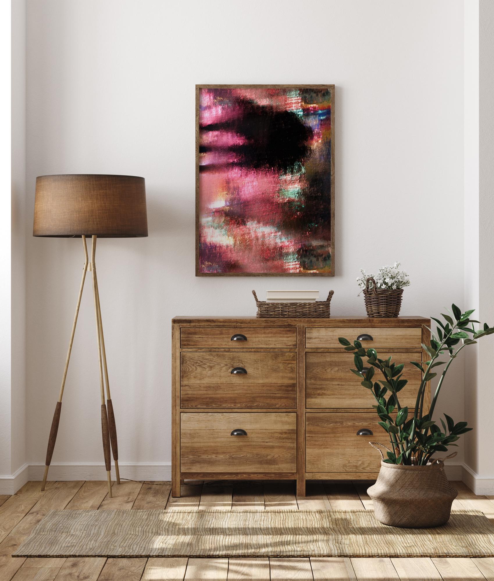 Idealne połączenie kolorów z dominującymi odcieniami różu wyróżnia ten wielokolorowy nadruk. U góry nadruku znajduje się czarny obszar, który tworzy poczucie głębi. Po prawej stronie czarnego obszaru znajduje się pionowa forma rurowa w czerwieni i zieleni. Idealny plakat do nadania koloru neutralnej ścianie.